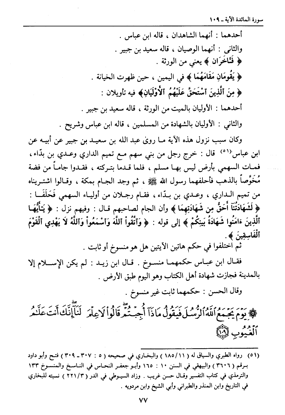 أحدهما: أنهما الوصيان إن ارتبتم بهما في الخيانة أَحْلَفَهُمَا الورثة. والثاني: أنهما الشاهدان إن ارتبتم بهما , ولم تُعْرَفْ عدالتهما , ولا جرحهما , أحلفهما الحاكم ليزول عنه الارتياب بهما , وهذا إنما جوزه قائل هذا القول في السفر دون الحضر. وفي قوله تعالى: {لاَ نَشْتَرِي بِهِ ثَمَناً} تأويلان: أحدهما: لا نأخذ عليه رشوة , قاله ابن زيد. والثاني: لا نعتاض عليه بحق. {وَلَو كَانَ ذَا قُرْبَى} أي لا نميل مع ذي القربى في قول الزور , والشهادة بغير حق. {وَلاَ نَكْتُمُ شَهَادَةَ اللَّهِ} يعني عندنا فيما أوجبه علينا. قوله تعالى: {فَإِنْ عُثِرَ عَلَى أَنَّهُمَا اسْتَحَقَّا إِثْماً} يعني فإن ظهر على أنهما كَذَبَا وخَانَا , فعبر عن الكذب بالخيانة والإِثم لحدوثه عنهما. وفي الذين: {عُثِرَ عَلَى أَنَّهُمَا اْسْتَحَقَّا إِثْماً} قولان: أحدهما: أنهما الشاهدان , قاله ابن عباس. والثاني: أنهما الوصيان , قاله سعيد بن جبير. {فَئَاخَرَان} يعني من الورثة. {يَقُومَانِ مَقَامَهُمَا} في اليمين , حين ظهرت الخيانة. {مِنَ الَّذِينَ اسْتَحَقَّ عَلَيْهُمُ الأَوْلَيَانِ} فيه تأويلان: أحدهما: الأوليان بالميت من الورثة , قاله سعيد بن جبير. والثاني: الأوليان بالشهادة من المسلمين , قاله ابن عباس وشريح. وكان سبب نزول هذه الآية ما روى عبد الله بن سعيد بن جبير عن أبيه عن ابن عباس قال: خرج رجل من بني سهم مع تميم الداري وعدي بن بدّاء , فمات السهمي بأرض ليس بها مسلم , فلما قدما بتركته , فقدوا جاماً من فضة مُخَوَّصاً بالذهب فأحلفهما رسول الله صلى الله عليه وسلم , ثم وجد الجام بمكة , وقالوا اشتريناه من تميم الداري , وعدي بن بدّاء , فقام رجلان من أولياء السهمي فَحَلَفَا: {لَشَهَادَتُنا أَحَقُّ مِن شَهَادَتِهِمَا} وأن الجام لصاحبهم قال: وفيهم نزل: {يَا أَيُّهَا الَّذِينَءَامَنُِوا شَهَادَةُ بَينِكُمْ} إلى قوله: {واتَّقُواْ اللَّهَ وَاسْمَعُواْ لاَ يَهْدِي الْقَوْمَ الْفَاسِقِينَ}. ثم اختلفوا في حكم هاتي الآيتين هل هو منسوخ أو ثابت. فقال ابن عباس حكمهما منسوخ. قال ابن زيد: لم يكن الإسلام إلا بالمدينة فجازت شهادة أهل الكتاب وهو اليوم طبق الأرض. وقال الحسن: حكمهما ثابت غير منسوخ.