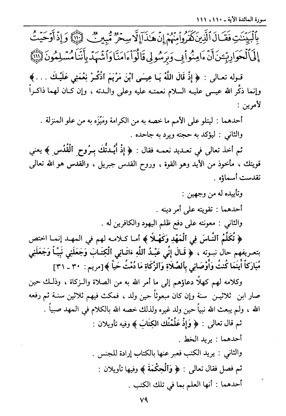 بالبينات فقال الذين كفروا منهم إن هذا إلا سحر مبين وإذ أوحيت إلى الحواريين أن آمنوا بي وبرسولي قالوا آمنا واشهد بأننا مسلمون} قوله تعالى: {إِذْ قَالَ اللَّهُ يَا عِيسَى ابْنَ مَرْيَمَ اذْكُرْ نِعْمَتِي عَلَيْكَ ... } وإنما ذكَّر الله عيسى عليه السلام نعمته عليه على والدته , وإن كان لهما ذاكراً لأمرين: أحدهما: ليتلو على الأمم ما خصه به من الكرامة ومَيّزَه به من علو المنزلة. والثاني: ليؤكد به حجته ويرد به جاحده. ثم أخذ تعالى في تعديد نعمه فقال: {إِذْ أَيَّدتُّكَ بِرُوحِ الْقُدُسِ} يعني قويتك , مأخوذ من الأيد وهو القوة , وروح القدس جبريل , والقدس هو الله تعالى تقدست أسماؤه. وتأييده له من وجهين: أحدهما: تقويته على أمر دينه. والثاني: معونته على دفع ظلم اليهود والكافرين له. {تُكَلِّمُ النَّاسَ فِي الْمَهْدِ وَكَهْلاً} أما كلامه لهم في المهد إنما اختص بتعريفهم حال نبوته , {قَالَ إِنِّي عَبْدُ اللَّهِءَاتَانِي الْكِتَابَ وَجَعَلَنِي نَبِيَّاً وَجَعَلَنِي مُبَارَكَاً أَيَنَمَا كُنتُ وَأَوْصانِي بِالصَّلاَةِ وَالزَّكَاةِ مَا دُمْتُ حَياً} [مريم: 30 - 31]. وكلامه لهم كهلاً دعاؤهم إلى ما أمر الله به من الصلاة والزكاة , وذلك حين صار ابن ثلاثين سنة وإن كان مبعوثاً حين ولد , فمكث فيهم ثلاثين سنة ثم رفعه الله , ولم يبعث الله نبياً حين ولد غيره ولذلك خصه الله بالكلام في المهد صبياً. ثم قال تعالى: {وَإِذْ عَلَّمْتُك الكِتَابَ} وفيه تأويلان: أحدهما: يريد الخط. والثاني: يريد الكتب فعبر عنها بالكتاب إرادة للجنس. ثم فصل فقال تعالى: {وَالْحِكْمَةَ} وفيها تأويلان: أحدهما: أنها العلم بما في تلك الكتب.