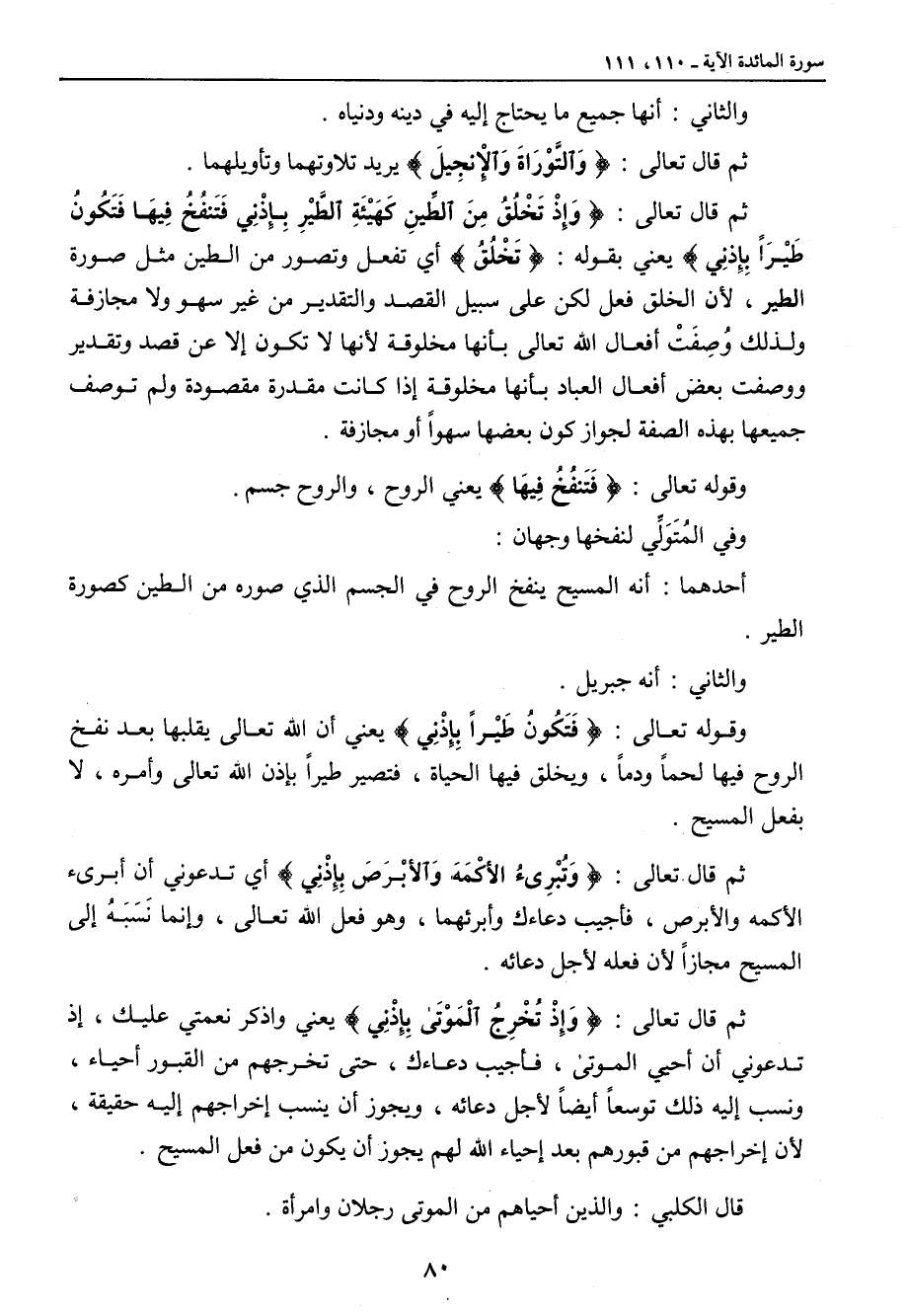 والثاني: أنها جميع ما يحتاج إليه في دينه ودنياه. ثم قال تعالى: {وَالتَّوْرَاةَ وَالإِنْجِيلَ} يريد تلاوتهما وتأويلهما. ثم قال تعالى: {وَإِذْ تَخْلُقُ مِنَ الطِّينِ كَهَيْئَةِ الطَّيْرِ بِإِذْنِي فَتَنفُخُ فِيهَا فَتَكُونَ طَيْرَاً بِإِذنِي} يعني بقوله: {تَخْلُقُ} أي تفعل وتصور من الطين مثل صورة الطير , لأن الخلق فعل لكن على سبيل القصد والتقدير من غير سهو ولا مجازفة ولذلك وُصِفَتْ أفعال الله تعالى بأنها مخلوقة لأنها لا تكون إلا عن قصد وتقدير ووصفت بعض أفعال العباد بأنها مخلوقة إذا كانت مقدرة مقصودة ولم توصف جميعها بهذه الصفة لجواز كون بعضها سهواً أو مجازفة. وقوله تعالى: {فَتَنفُخُ فِيهَا} يعني الروح , والروح جسم. وفي المُتَوَلِّي لنفخها وجهان: أحدهما: أنه المسيح ينفخ الروح في الجسم الذي صوره من الطين كصورة الطير. والثاني: أنه جبريل. وقوله تعالى: {فَتَكُونُ طَيْراً بِإِذْنِي} يعني أن الله تعالى يقلبها بعد نفخ الروح فيها لحماً ودماً , ويخلق فيها الحياة , فتصير طيراً بإذن الله تعالى وأمره , لا بفعل المسيح. ثم قال تعالى: {وَتُبْرِىءُ الأكْمَهَ وَالأَبْرَصَ بِإِذْنِي} أي تدعوني أن أبرىء الأكمه والأبرص , فأجيب دعاءك وأبرئهما , وهو فعل الله تعالى , وإنما نَسَبَهُ إلى المسيح مجازاً لأن فعله لأجل دعائه. ثم قال تعالى: {وَإِذْ تُخْرِجُ الْمَوْتَى بِإِذْنِي} يعني واذكر نعمتي عليك , إذ تدعوني أن أحيي الموتى , فأجيب دعاءك , حتى تخرجهم من القبور أحياء , ونسب إليه ذلك توسعاً أيضاً لأجل دعائه , ويجوز أن ينسب إخراجهم إليه حقيقة , لأن إخراجهم من قبورهم بعد إحياء الله لهم يجوز أن يكون من فعل المسيح. قال الكلبي: والذين أحياهم من الموتى رجلان وامرأة.