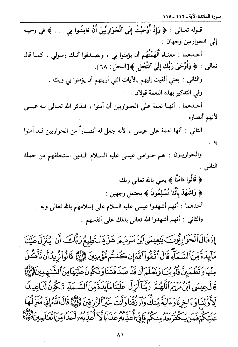 قوله تعالى: {وَإِذْ أَوْحَيْتُ إِلَى الْحَوَارِيِّيِنَ أَنْءَامِنُوا بِي ... } في وحيه إلى الحواريين وجهان: أحدهما: معناه أَلْهَمْتُهُم أن يؤمنوا بي , ويصدقوا أنك رسولي , كما قال تعالى: {وَأَوْحَى رَبُّكَ إِلَى النَّحْلِ} [النحل: 68]. والثاني: يعني ألقيت إليهم بالآيات التي أريتهم أن يؤمنوا بي وبك. وفي التذكير بهذه النعمة قولان: أحدهما: أنها نعمة على الحواريين أن آمنوا , فذكر الله تعالى به عيسى لأنهم أنصاره. الثاني: أنها نعمة على عيسى , لأنه جعل له أنصاراً من الحواريين قد آمنوا به. والحواريون: هم خواص عيسى عليه السلام الذين استخلفهم من جملة الناس. {قَالُواءَامَنَّا} يعني بالله تعالى ربك. {وَاشْهَدْ بِأَنَّنَا مُسْلِمُونَ} يحتمل وجهين: أحدهما: أنهم أشهدوا عيسى عليه السلام على إسلامهم بالله تعالى وبه. والثاني: أنهم أشهدوا الله تعالى بذلك على أنفسهم.