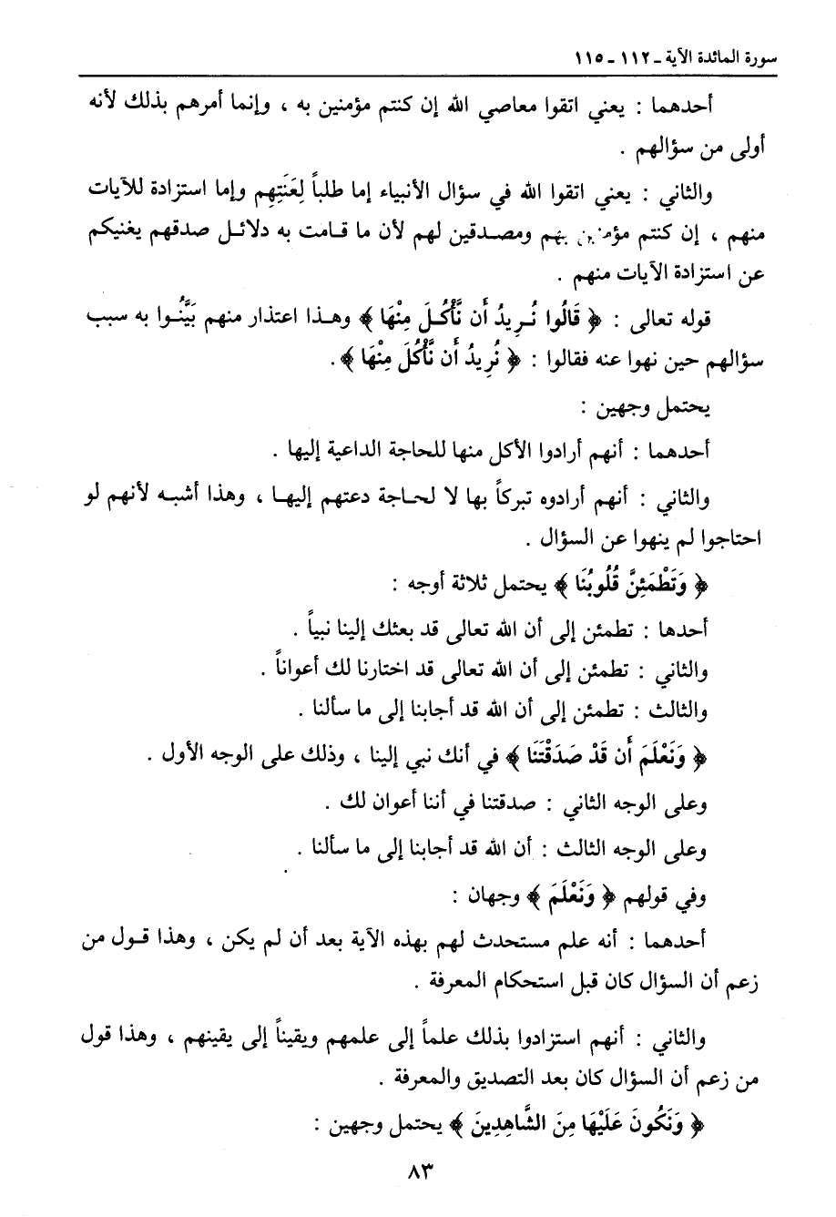 أحدهما: يعني اتقوا معاصي الله إن كنتم مؤمنين به , وإنما أمرهم بذلك لأنه أولى من سؤالهم. والثاني: يعني اتقوا الله فى سؤال الأنبياء إما طلباً لِعَنَتِهِم وإما استزادة للآيات منهم , إن كنتم مؤمنين بهم ومصدقين لهم لأن ما قامت به دلائل صدقهم يغنيكم عن استزادة الآيات منهم. قوله تعالى: {قَالُوا نُرِيدُ أَن نَّأْكُلَ مِنْهَا} وهذا اعتذار منهم بَيَّنُوا به سبب سؤالهم حين نهوا عنه فقالوا: {نُرِيدُ أَن نَّأْكُلَ مِنْهَا}. يحتمل وجهين: