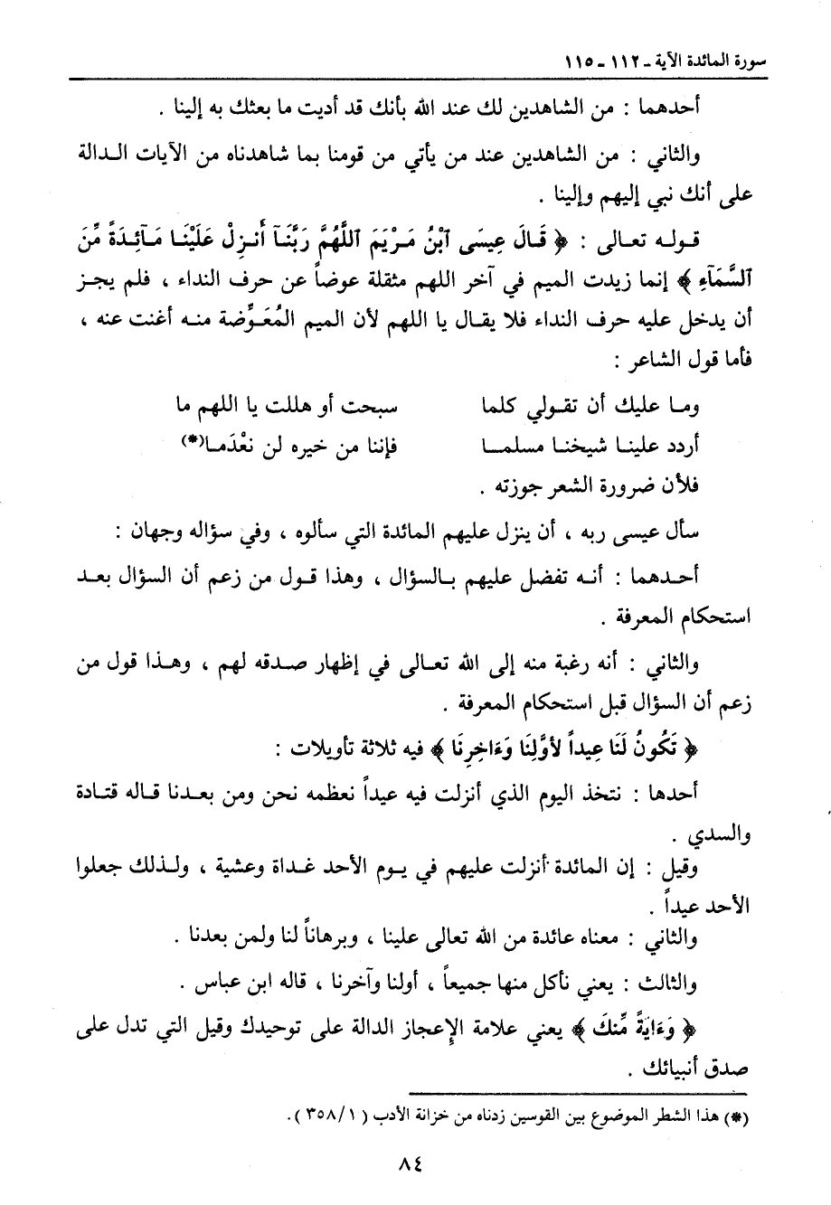فلأن ضرورة الشعر جوزته. سأل عيسى ربه , أن ينزل عليهم المائدة التي سألوه , وفي سؤاله وجهان: أحدهما: أنه تفضل عليهم بالسؤال , وهذا قول من زعم أن السؤال بعد استحكام المعرفة. والثاني: أنه رغبة منه إلى الله تعالى في إظهار صدقه لهم , وهذا قول من زعم أن السؤال قبل استحكام المعرفة. {تَكُونُ لَنَا عِيداً لأوَّلِنَا وَءَاخِرِنَا} فيه ثلاثة تأويلات: أحدها: نتخذ اليوم الذي أنزلت فيه عيداً نعظمه نحن ومن بعدنا قاله قتادة والسدي. وقيل: إن المائدة أنزلت عليهم في يوم الأحد غداة وعشية , ولذلك جعلوا الأحد عيداً. والثاني: معناه عائدة من الله تعالى علينا , وبرهاناً لنا ولمن بعدنا. والثالث: يعني نأكل منها جميعاً , أولنا وآخرنا , قاله ابن عباس. {وَءَايَةً مِّنكَ} يعني علامة الإِعجاز الدالة على توحيدك وقيل التي تدل على صدق أنبيائك.