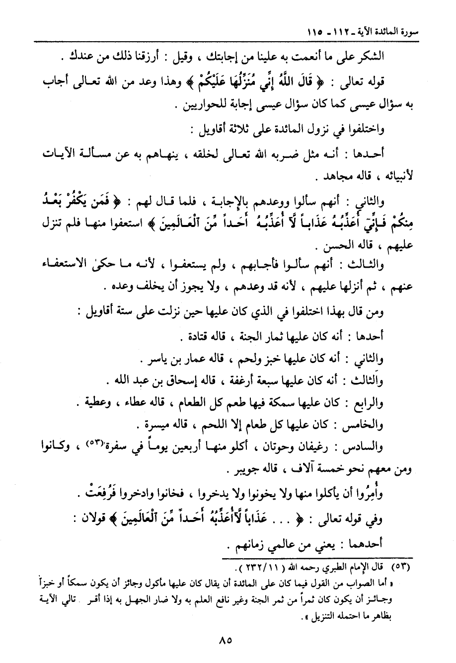 الشكر على ما أنعمت به علينا من إجابتك , وقيل: أرزقنا ذلك من عندك. قوله تعالى: {قَالَ اللَّهُ إِنِّي مُنَزِّلُهَا عَلَيْكُمْ} وهذا وعد من الله تعالى أجاب به سؤال عيسى كما كان سؤال عيسى إجابة للحواريين. واختلفوا في نزول المائدة على ثلاثة أقاويل. أحدها: أنه مثل ضربه الله تعالى لخلقه , ينهاهم به عن مسألة الآيات لأنبيائه , قاله مجاهد. والثاني: أنهم سألوا ووعدهم بالإِجابة , فلما قال لهم: {فَمَن يَكْفُرْ بَعْدُ مِنكُمْ فَإِنِّي أُعَذِّبُهُ عَذَاباً لاَّ أُعَذِّبُهُ أَحَداً مِّنَ الْعَالَمِينَ} استعفوا منها فلم تنزل عليهم , قاله الحسن. والثالث: أنهم سألوا فأجابهم , ولم يستعفوا , لأنه ما حكى الاستعفاء عنهم , ثم أنزلها عليهم , لأنه قد وعدهم , ولا يجوز أن يخلف وعده. ومن قال بهذا اختلفوا في الذي كان عليها حين نزلت على ستة أقاويل: أحدها: أنه كان عليها ثمار الجنة , قاله قتادة. والثاني: أنه كان عيها خبز ولحم , قاله عمار بن ياسر. والثالث: أنه كان عليها سبعة أرغفة , قاله إسحاق بن عبد الله. والرابع: كان عليها سمكة فيها طعم كل الطعام , قاله عطاء , وعطية. والخامس: كان عليها كل طعام إلا اللحم , قاله ميسرة. والسادس: رغيفان وحوتان , أكلو منها أربعين يوماً في سفرة , وكانوا ومن معهم نحو خمسة آلاف , قاله جويبر. وأُمِرُوا أن يأكلوا منها ولا يخونوا ولا يدخروا , فخانوا وادخروا فَرُفِعَتْ. وفي قوله تعالى: { ... عَذَاباً لاَّأُعَذِّبُهُ أَحَداً مِّنَ الْعَالَمِينَ} قولان: أحدهما: يعني من عالمي زمانهم.
