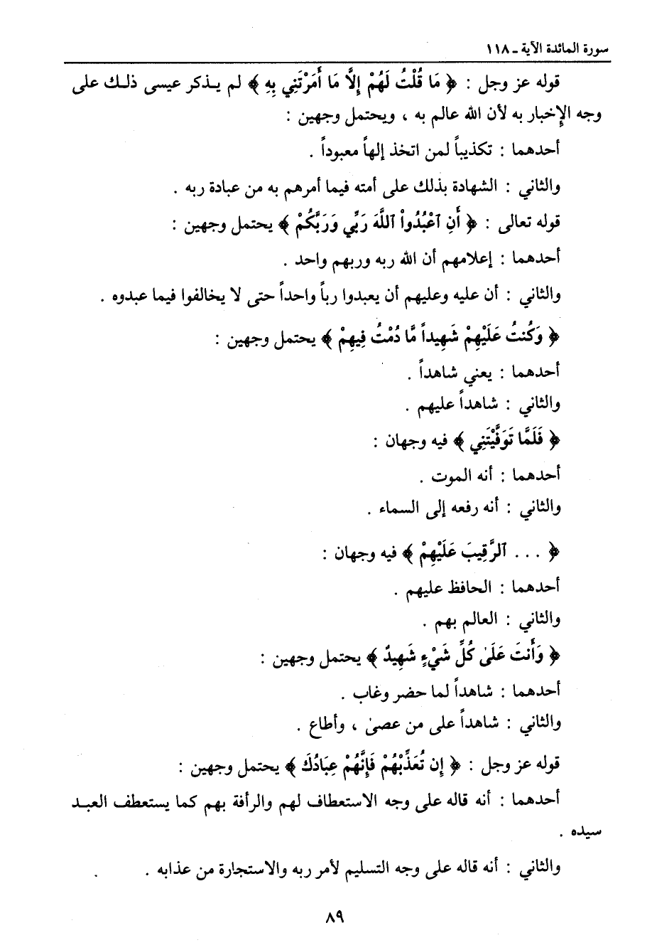 قوله عز وجل: {مَا قُلْتُ لَهُمْ إِلاَّ مَا أَمَرْتَنِي بِهِ} لم يذكر عيسى ذلك على وجه الإِخبار به لأن الله عالم به , ويحتمل وجهين: أحدهما: تكذيباً لمن اتخذ إلهاً معبوداً. والثاني: الشهادة بذلك على أمته فيما أمرهم به من عبادة ربه. قوله تعالى: {أَنِ اعْبُدُواْ اللَّهَ رَبِّي وَرَبَّكُمْ} يحتمل وجهين: أحدهما: إعلامهم أن الله ربه وربهم واحد. والثاني: أن عليه وعليهم أن يعبدوا رباً واحداً حتى لا يخالفوا فيما عبدوه. {وَكُنتُ عَلَيْهِمْ شَهِيداً مَّا دُمْتُ فِيِهِمْ} يحتمل وجهين: أحدهما: يعني شاهداً. والثاني: شاهداً عليهم. {فَلَمَّا تَوَفَّيْتَنِي} فيه وجهان: أحدهما: أنه الموت. والثاني: أنه رفعه إلى السماء. { ... الرَّقِيبَ عَلَيْهِمْ} فيه وجهان: أحدهما: الحافظ عليهم. والثاني: العالم بهم. {وَأَنتَ عَلَى كُلِّ شَيْءٍ شَهِيدٌ} يحتمل وجهين: أحدهما: شاهداً لما حضر وغاب. والثاني: شاهداً على من عصى , وأطاع. قوله عز وجل: {إِن تُعَذِّبْهُمْ فَإِنَّهُمْ عِبَادُكَ} يحتمل وجهين: أحدهما: أنه قاله على وجه الاستعطاف لهم والرأفة بهم كما يستعطف العبد سيده. والثاني: أنه قاله على وجه التسليم لأمر ربه والاستجارة من عذابه.