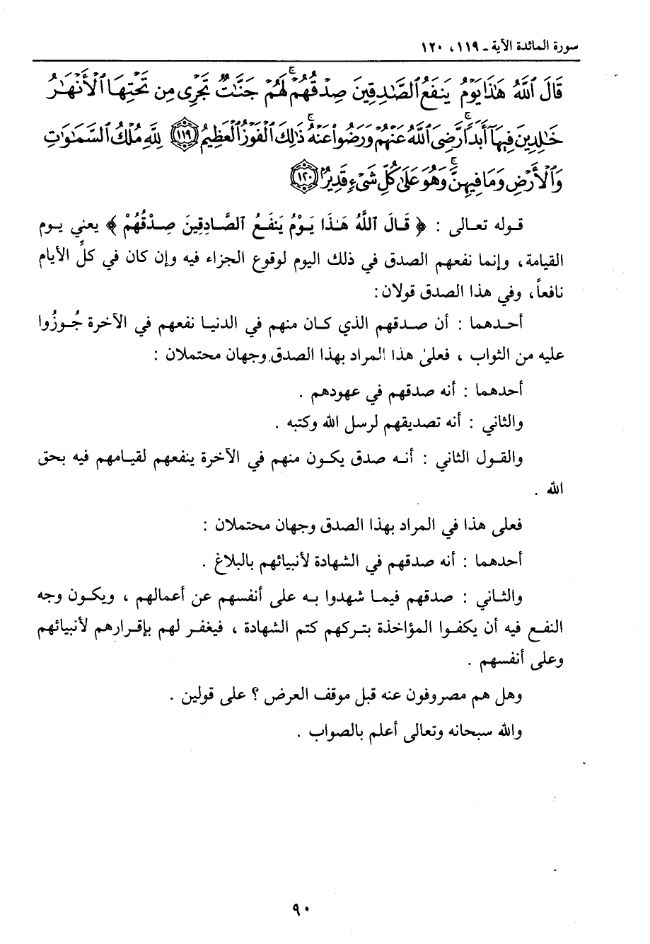 {قال الله هذا يوم ينفع الصادقين صدقهم لهم جنات تجري من تحتها الأنهار خالدين فيها أبدا رضي الله عنهم ورضوا عنه ذلك الفوز العظيم لله ملك السماوات والأرض وما فيهن وهو على كل شيء قدير} قوله تعالى: {قَالَ اللَّهُ هَذَا يَوْمُ يَنفَعُ الصَّادِقِينَ صِدْقُهُمْ} يعني يوم القيامة , وإنما نفعهم الصدق في ذلك اليوم لوقوع الجزاء فيه وإن كان في كلِّ الأيام نافعاً , وفي هذا الصدق قولان: أحدهما: أن صدقهم الذي كان منهم في الدنيا نفعهم في الآخرة جُوزُوا عليه من الثواب , فعلى هذا المراد بهذا الصدق وجهان محتملان: أحدهما: أنه صدقهم في عهودهم. والثاني: أنه تصديقهم لرسل الله وكتبه. والقول الثاني: أنه صدق يكون منهم في الآخرة ينفعهم لقيامهم فيه بحق الله. فعلى هذا في المراد بهذا الصدق وجهان محتملان: أحدهما: أنه صدقهم في الشهادة لأنبيائهم بالبلاغ. والثاني: صدقهم فيما شهدوا به على أنفسهم عن أعمالهم , ويكون وجه النفع فيه أن يكفوا المؤاخذة بتركهم كتم الشهادة , فيغفر لهم بإقرارهم لأنبيائهم وعلى أنفسهم. وهل هم مصروفون عنه قبل موقف العرض؟ على قولين. والله سبحانه وتعالى أعلم بالصواب.