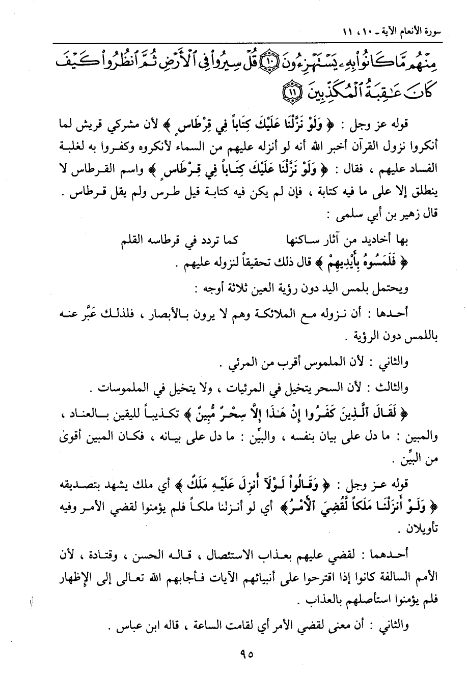 منهم ما كانوا به يستهزؤون قل سيروا في الأرض ثم انظروا كيف كان عاقبة المكذبين} قوله عز وجل: {وَلَوْ نَزَّلْنَا عَلَيْكَ كِتَاباً فِي قِرْطَاسٍ} لأن مشركي قريش لما أنكروا نزول القرآن أخبر الله أنه لو أنزله عليهم من السماء لأنكروه وكفروا به لغلبة الفساد عليهم , فقال: {ولَوْ نَزَّلْنَا عَلَيْكَ كِتَاباً فِي قِرْطَاسٍ} واسم القرطاس لا ينطلق إلا على ما فيه كتابة , فإن لم يكن فيه كتابة قيل طرس ولم يقل قرطاس. قال زهير بن أبي سلمى: