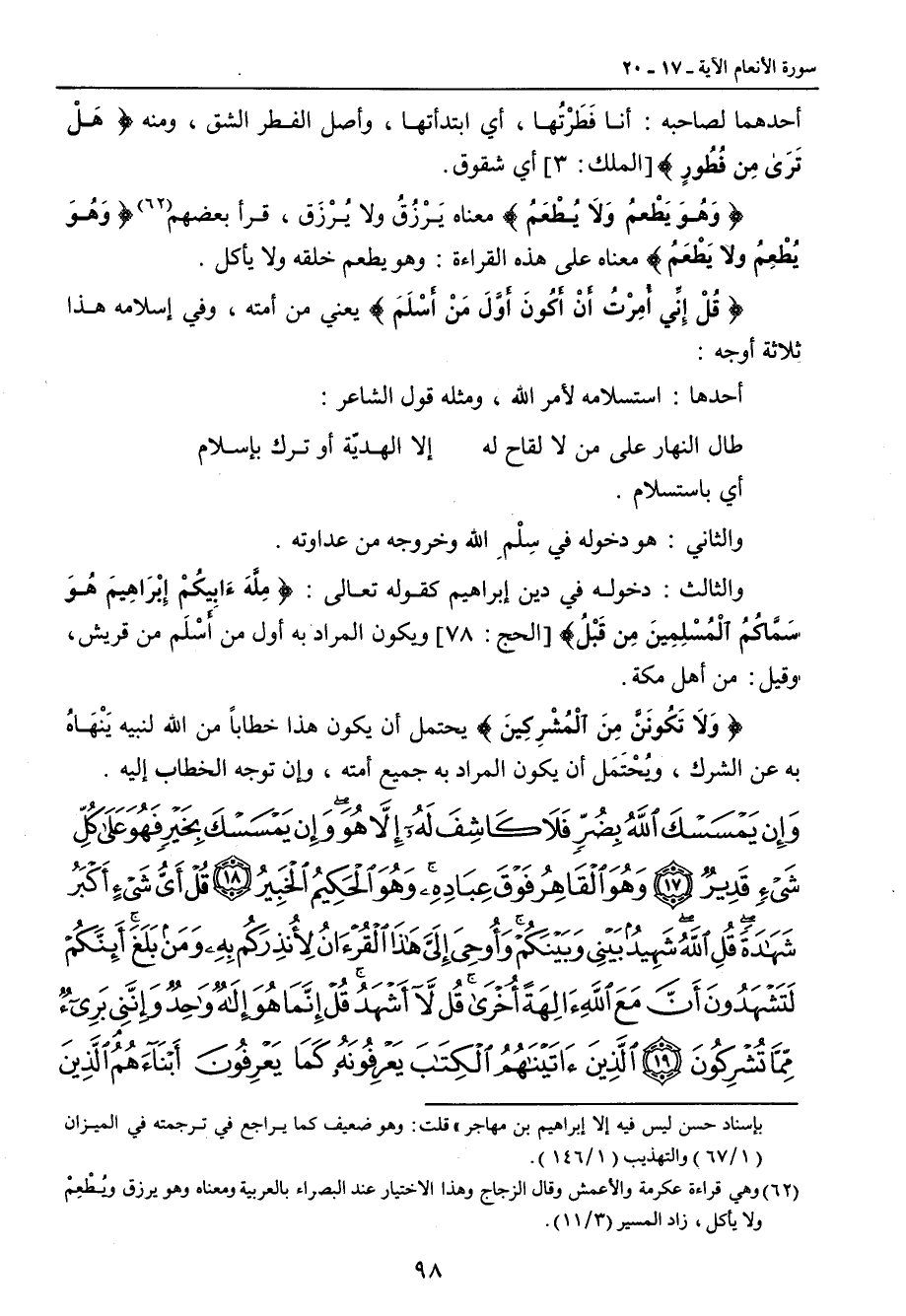 أحدهما لصاحبه: أنا فَطَرْتُهَا , أي ابتدأتها , وأصل الفطر الشق , ومنه {هَلْ تَرَى مِن فُطُورٍ} [الملك: 3] أي شقوق. {وَهُوَ يَطْعمُ وَلاَ يُطْعَمُ} معناه يَرْزُقُ ولا يُرْزَق , قرأ بعضهم {وَهُوَ يُطْعِمُ ولا يَطْعَمُ} معناه على هذه القراءة: وهو يطعم خلقه ولا يأكل. {قُلْ إِنِّي أُمِرْتُ أَنْ أَكُونَ أَوَّلَ مَنْ أَسْلَمَ} يعني من أمته , وفي إسلامه هذا ثلاثة أوجه: أحدها: استسلامه لأمر الله , ومثله قول الشاعر:
