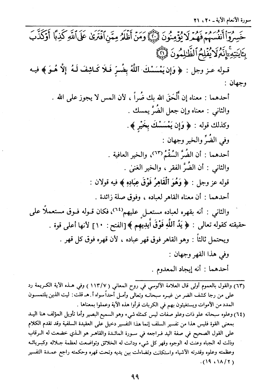 خسروا أنفسهم فهم لا يؤمنون ومن أظلم ممن افترى على الله كذبا أو كذب بآياته إنه لا يفلح الظالمون} قوله تعالى: {وَإِن يَمْسَسْكَ اللَّهُ بِضُرٍّ فَلاَ كَاشِفَ لَهُ إِلاَّ هُوَ} فيه وجهان: أحدهما: معناه إن أَلْحَقَ الله بك ضُراً , لأن المس لا يجوز على الله. والثاني: معناه وإن جعل الضُرَّ يمسك. وكذلك قوله: {وَإِن يَمْسَسْكَ بِخَيْرٍ}. وفي الضُرِّ والخير وجهان: أحدهما: أن الضُرَّ السُقْمُ , والخير العافية. والثاني: أن الضُرَّ الفقر , والخير الغنى. قوله عز وجل: {وَهُوَ الْقَاهِرُ فَوْقَ عِبَادِهِ} فيه قولان: أحدهما: أن معناه القاهر لعباده , وفوق صلة زائدة. والثاني: أنه بقهره لعباده مستعلٍ عليهم , فكان قوله فوق مستعملاً على حقيقته كقوله تعالى: {يَدُ اللَّهِ فَوْقَ أَيدِيهِم} [الفتح: 10] لأنها أعلى قوة. ويحتمل ثالثاً: وهو القاهر فوق قهر عباده , لأن قهره فوق كل قهر. وفي هذا القهر وجهان: أحدهما: أنه إيجاد المعدوم.
