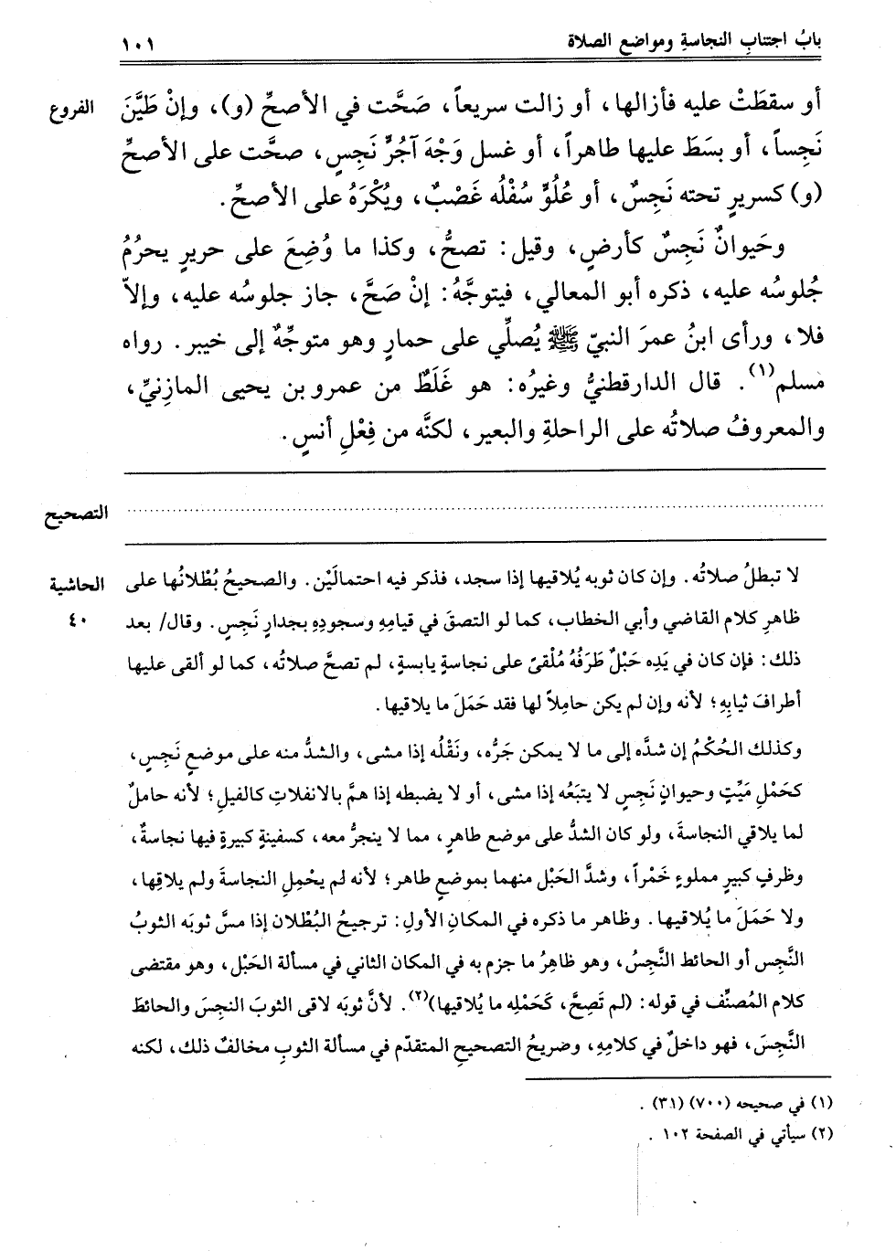 وَحَيَوَانٌ نَجِسٌ كَأَرْضٍ، وَقِيلَ تَصِحُّ، وَكَذَا مَا وُضِعَ عَلَى حَرِيرٍ يَحْرُمُ جُلُوسُهُ عَلَيْهِ، ذَكَرَهُ أَبُو الْمَعَالِي، فَيُتَوَجَّهُ إنْ صَحَّ جَازَ جُلُوسُهُ، وإلا فلا. رأى ابْنُ عُمَرَ النَّبِيَّ صَلَّى اللَّهُ عَلَيْهِ وَسَلَّمَ يُصَلِّي عَلَى حِمَارٍ وَهُوَ مُتَوَجِّهٌ إلَى خَيْبَرَ. رَوَاهُ مُسْلِمٌ.1 قَالَ الدَّارَقُطْنِيُّ وَغَيْرُهُ: هُوَ غَلَطٌ مِنْ عَمْرِو بْنِ يَحْيَى الْمَازِنِيِّ، وَالْمَعْرُوفُ صَلَاتُهُ عَلَى الرَّاحِلَةِ وَالْبَعِيرِ، لَكِنَّهُ مِنْ فِعْلِ أَنَسٍ.