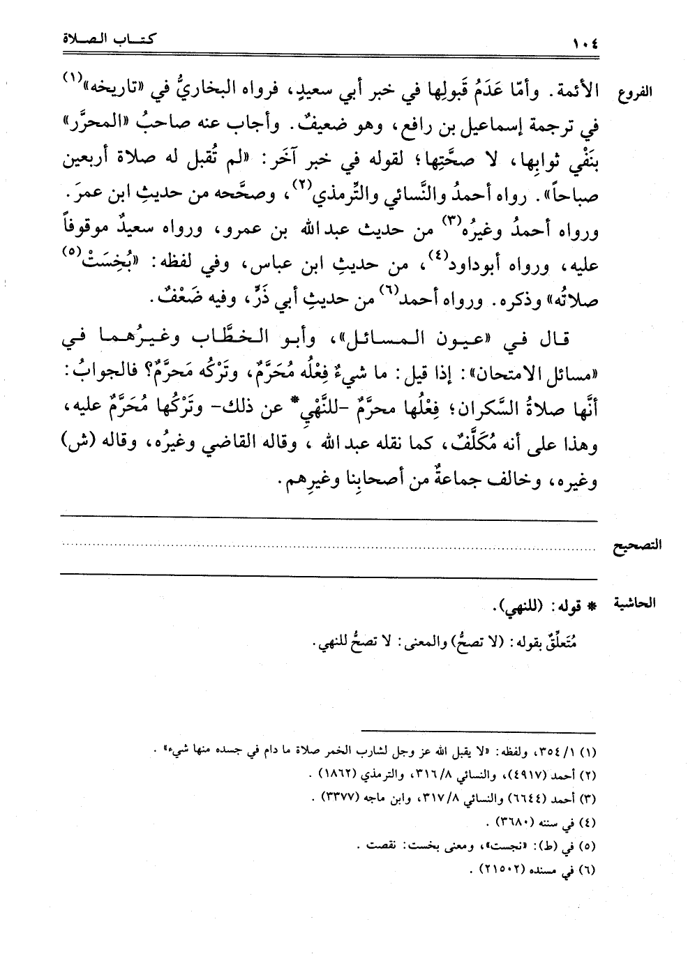 الْأَئِمَّةِ. وَأَمَّا عَدَمُ قَبُولِهَا فِي خَبَرِ أَبِي سَعِيدٍ فَرَوَاهُ الْبُخَارِيُّ فِي تَارِيخِهِ1 فِي تَرْجَمَةِ إسْمَاعِيلَ بْنِ رَافِعٍ، وَهُوَ ضَعِيفٌ، وَأَجَابَ عَنْهُ صَاحِبُ الْمُحَرَّرِ بِنَفْيِ ثَوَابِهَا، لَا صِحَّتِهَا، لِقَوْلِهِ فِي خَبَرٍ آخَرَ "لَمْ يُقْبَلْ لَهُ صَلَاةٌ أَرْبَعِينَ صَبَاحًا".رَوَاهُ أَحْمَدُ وَالنَّسَائِيُّ وَالتِّرْمِذِيُّ2، وَصَحَّحَهُ مِنْ حَدِيثِ ابْنِ عُمَرَ، وَرَوَاهُ أَحْمَدُ وَغَيْرُهُ3 مِنْ حَدِيثِ عَبْدِ اللَّهِ بْنِ عَمْرٍو، وَرَوَاهُ سَعِيدٌ مَوْقُوفًا عَلَيْهِ، وَرَوَاهُ أَبُو دَاوُد4 مِنْ حديث ابن عباس، وفي لفظه "بخست"5. ذكره وَرَوَاهُ أَحْمَدُ6 مِنْ حَدِيثِ أَبِي ذَرٍّ، وَفِيهِ ضَعْفٌ.