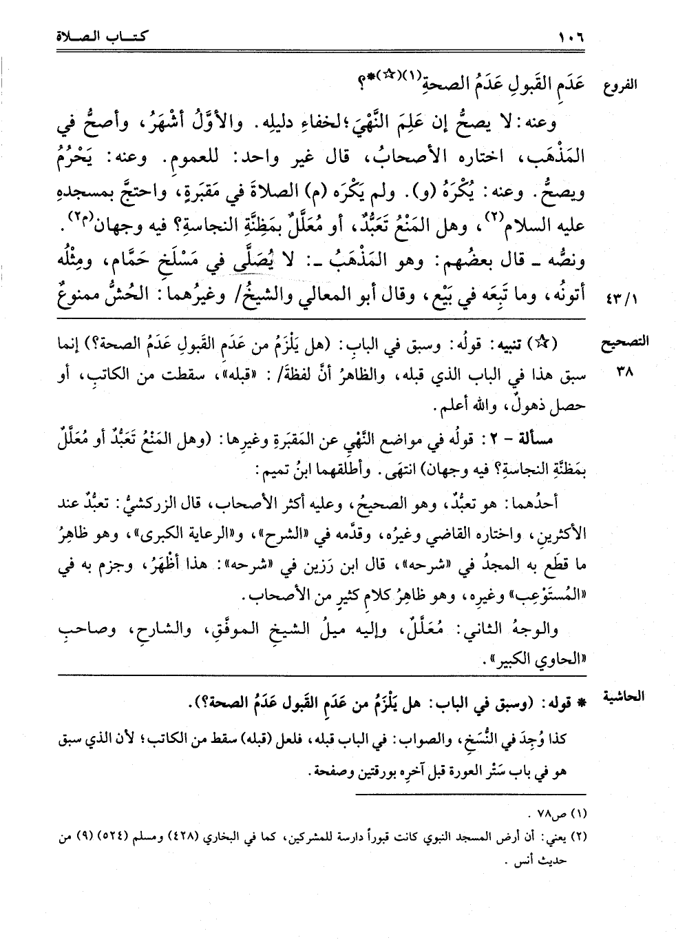 مَسْأَلَةٌ 2: قَوْلُهُ فِي مَوَاضِعِ النَّهْيِ عَنْ الْمَقْبَرَةِ وَغَيْرِهَا: وَهَلْ الْمَنْعُ تَعَبُّدٌ أَوْ مُعَلَّلٌ بِمَظِنَّةِ النَّجَاسَةِ، فِيهِ وَجْهَانِ، انْتَهَى، وَأَطْلَقَهُمَا ابْنُ تَمِيمٍ.
