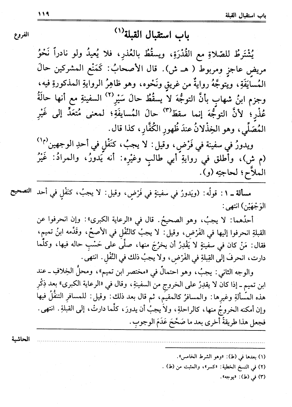 وَالْوَجْهُ الثَّانِي: يَجِبُ، وَهُوَ احْتِمَالٌ فِي مُخْتَصَرِ ابْنِ تَمِيمٍ، وَمَحَلُّ الْخِلَافِ عِنْدَ ابْنِ تَمِيمٍ إذَا كَانَ لَا يَقْدِرُ عَلَى الْخُرُوجِ مِنْ السَّفِينَةِ. وَقَالَ فِي الرِّعَايَةِ الْكُبْرَى بَعْدَ ذِكْرِ هَذِهِ الْمَسْأَلَةِ وَغَيْرِهَا وَالْمُسَافِرُ كَالْمُقِيمِ، ثُمَّ قَالَ بَعْدَ ذَلِكَ وَقِيلَ: لِلْمُسَافِرِ التَّنَفُّلُ فِيهَا وَإِنْ أَمْكَنَهُ الْخُرُوجُ مِنْهَا كَالرَّاحِلَةِ، وَلَا يَجِبُ أَنْ يَدُورَ كُلَّمَا دَارَتْ إلَى الْقِبْلَةِ، انْتَهَى، فَجَعَلَ هَذَا طريقة أخرى بعدما صحح عدم الوجوب.