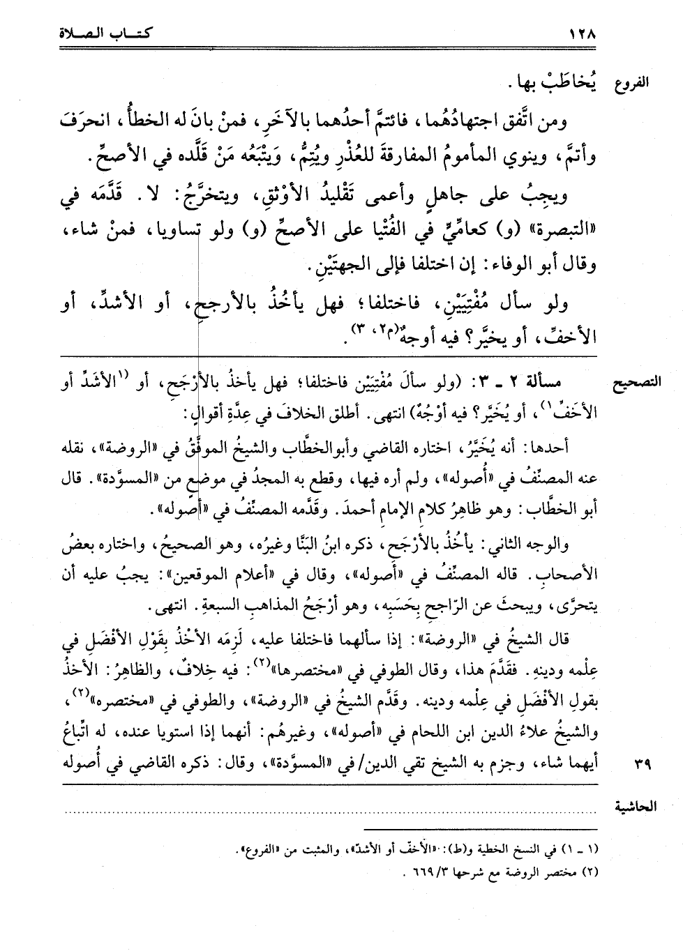 قَالَ الشَّيْخُ فِي الروضة: إذا سألهما فاختلفا عليه لَزِمَهُ الْأَخْذُ بِقَوْلِ الْأَفْضَلِ فِي عِلْمِهِ وَدِينِهِ، فَقَدَّمَ هَذَا. وَقَالَ الطُّوفِيُّ فِي مُخْتَصَرِهَا2: فِيهِ خِلَافٌ، وَالظَّاهِرُ الْأَخْذُ بِقَوْلِ الْأَفْضَلِ فِي عِلْمِهِ وَدِينِهِ، وَقَدَّمَ الشَّيْخُ فِي الرَّوْضَةِ، وَالطُّوفِيُّ فِي مُخْتَصَرِهِ2، وَالشَّيْخُ عَلَاءُ الدِّينِ بْنُ اللَّحَّامِ فِي أُصُولِهِ، وَغَيْرُهُمْ أَنَّهُمَا إذَا اسْتَوَيَا عِنْدَهُ لَهُ اتِّبَاعُ أَيِّهِمَا شَاءَ، وَجَزَمَ بِهِ الشَّيْخُ تَقِيُّ الدِّينِ فِي الْمُسَوَّدَةِ. وَقَالَ ذَكَرَهُ الْقَاضِي فِي أصوله