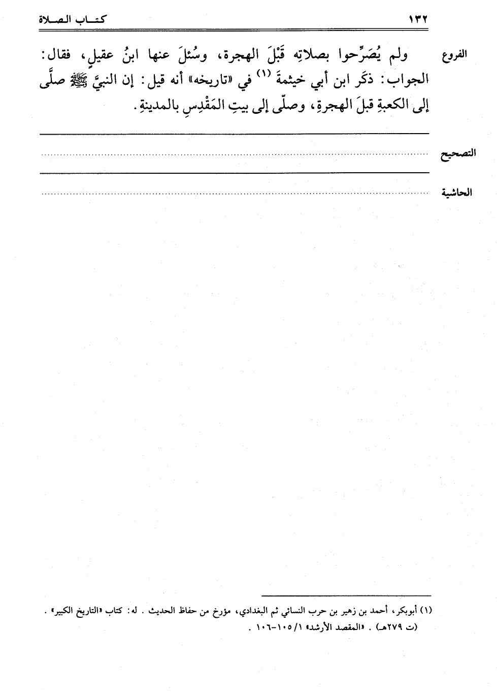 وَلَمْ يُصَرِّحُوا بِصَلَاتِهِ قَبْلَ الْهِجْرَةِ، وَسُئِلَ عَنْهَا ابْنُ عَقِيلٍ فَقَالَ: الْجَوَابُ: ذَكَرَ ابْنُ أَبِي خَيْثَمَةَ1 فِي تَارِيخِهِ أَنَّهُ قِيلَ: إنَّ النَّبِيَّ صَلَّى اللَّهُ عَلَيْهِ وَسَلَّمَ صَلَّى إلَى الْكَعْبَةِ قَبْلَ الْهِجْرَةِ، وَصَلَّى إلَى بَيْتِ الْمَقْدِسِ بِالْمَدِينَةِ.