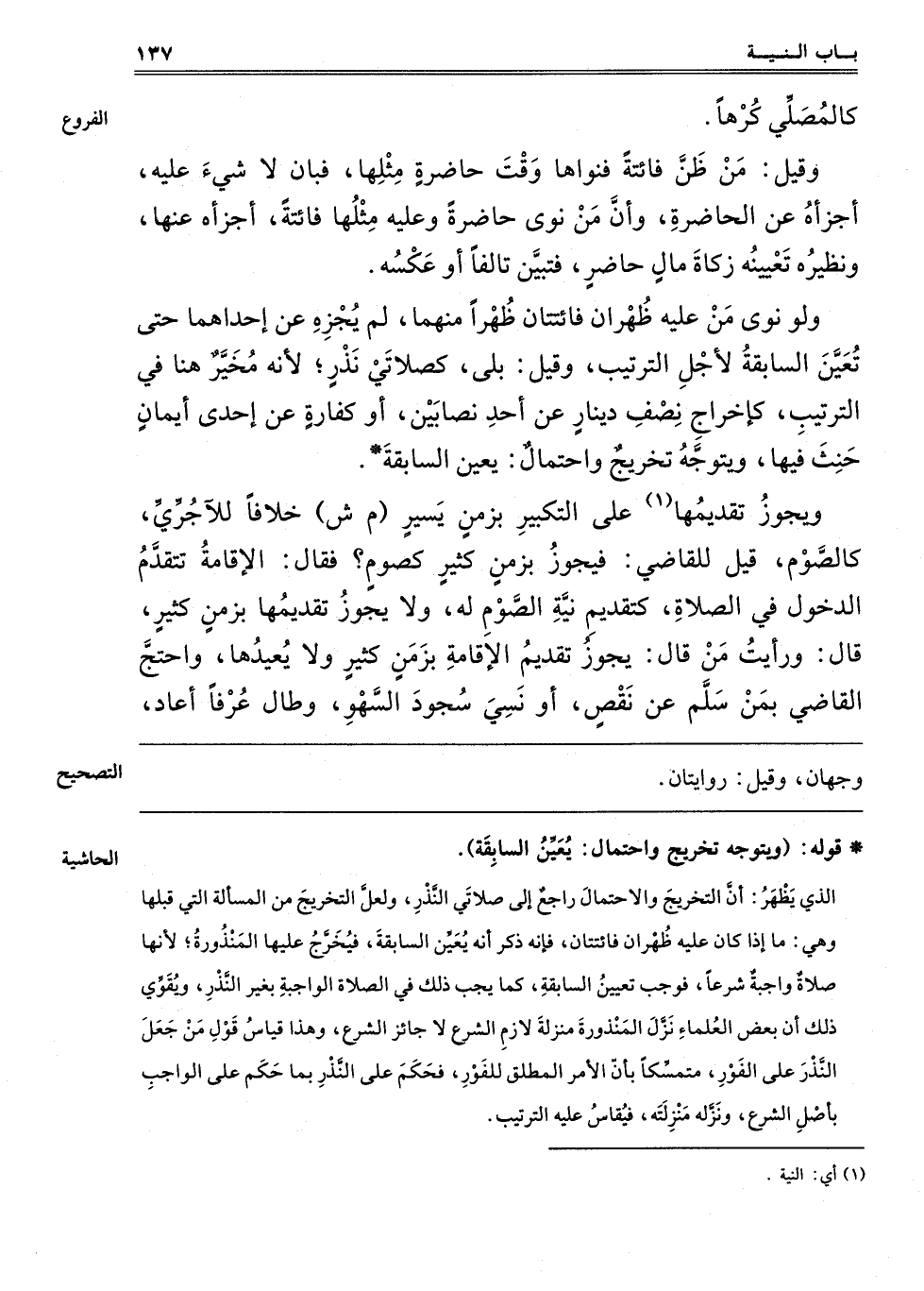 وَلَوْ نَوَى مَنْ عَلَيْهِ ظُهْرَانِ فَائِتَتَانِ ظُهْرًا مِنْهُمَا لَمْ يُجْزِهِ عَنْ أَحَدَيْهِمَا حَتَّى تُعَيَّنَ السَّابِقَةُ لِأَجْلِ التَّرْتِيبِ، وَقِيلَ بَلَى، كَصَلَاتَيْ نَذْرٍ، لِأَنَّهُ مُخَيَّرٌ هُنَا فِي التَّرْتِيبِ كَإِخْرَاجِ نِصْفِ دِينَارٍ عَنْ أَحَدِ نِصَابَيْنِ، أَوْ كَفَّارَةٍ عَنْ إحْدَى أَيْمَانٍ حَنِثَ فِيهَا، وَيُتَوَجَّهُ تَخْرِيجٌ، وَاحْتِمَالٌ يُعَيِّنُ السَّابِقَةَ.