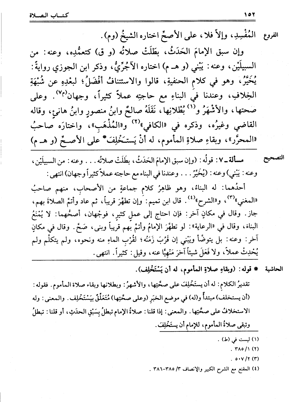 وإن سبق الإمام الحدث بطلت صلاته "وق" كتعمده، وعنه من السبيلين، وعنه يبني "وهـ م"، اخْتَارَهُ الْآجُرِّيُّ، وَذَكَرَ ابْنُ الْجَوْزِيِّ رِوَايَةً تُجْبَرُ، وَهُوَ فِي كَلَامِ الْحَنَفِيَّةِ، قَالُوا: وَالِاسْتِئْنَافُ أَفْضَلُ لِبُعْدِهِ عَنْ شُبْهَةِ الْخِلَافِ، وَعِنْدَنَا فِي الْبِنَاءِ مَعَ حَاجَتِهِ عَمَلًا كَثِيرًا وَجْهَانِ "م 7" وَالْأَشْهَرُ و1 بطلانها نَقَلَهُ صَالِحٌ وَابْنُ مَنْصُورٍ وَابْنُ هَانِئٍ، وَقَالَهُ الْقَاضِي وَغَيْرُهُ، وَذَكَرَهُ فِي الْكَافِي2 وَالْمُذْهَبِ، وَاخْتَارَهُ صَاحِبُ الْمُحَرَّرِ، وَبَقَاءُ صَلَاةِ الْمَأْمُومِ. وَلَهُ أَنْ يستخلف على الأصح "وهـ م"