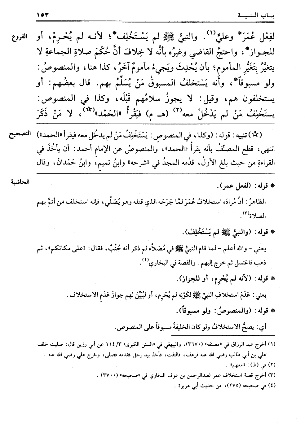 وَلِفِعْلِ عُمَرَ وَعَلِيٍّ1. وَالنَّبِيِّ صَلَّى اللَّهُ عَلَيْهِ وَسَلَّمَ لَمْ يَسْتَخْلِفْ لِأَنَّهُ لَمْ يُحْرِمْ أَوْ لِلْجَوَازِ، وَاحْتَجَّ الْقَاضِي وَغَيْرُهُ بِأَنَّهُ لَا خِلَافَ أَنَّ حُكْمَ صَلَاةِ الْجَمَاعَةِ لَا يَتَغَيَّرُ بِتَغَيُّرِ الْمَأْمُومِ بِأَنْ يُحْدِثَ وَيَجِيءَ مَأْمُومٌ آخَرُ، فَكَذَا هُنَا وَالْمَنْصُوصُ وَلَوْ مَسْبُوقًا، وَأَنَّهُ يَسْتَحْلِفُ الْمَسْبُوقُ مَنْ يُسَلِّمُ بِهِمْ، قَالَ بَعْضُهُمْ أَوْ يَسْتَخْلِفُونَ هُمْ، وَقِيلَ لَا يَجُوزُ سَلَامُهُمْ قَبْلَهُ، وَكَذَا في المنصوص يستخلف من لم يدخل مع2 "هـ م" فَيَقْرَأُ الْحَمْدَ، لَا مَنْ ذَكَرَ