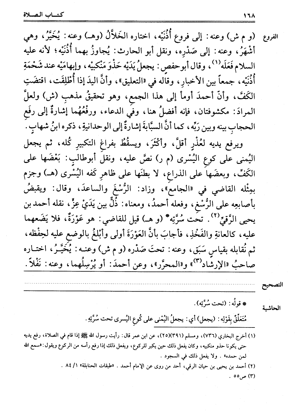 وَيَرْفَعُ لِعُذْرٍ أَقَلَّ، أَوْ أَكْثَرَ، وَيُسْقِطُ بِفَرَاغِ التَّكْبِيرِ كُلِّهِ، ثُمَّ يَجْمَعُ الْيُمْنَى عَلَى كُوعِ الْيُسْرَى "م" نَصَّ عَلَيْهِ، وَنَقَلَ أَبُو طَالِبٍ بَعْضُهَا عَلَى الْكَفِّ، وَبَعْضُهَا عَلَى الذِّرَاعِ، لَا بَطْنُهَا عَلَى ظَاهِرِ كَفِّهِ الْيُسْرَى "هـ" وَجَزَمَ بِمِثْلِهِ الْقَاضِي فِي الْجَامِعِ، وَزَادَ الرُّسْغَ وَالسَّاعِدَ، وَقَالَ: وَيَقْبِضُ بِأَصَابِعِهِ عَلَى الرُّسْغِ، وَفَعَلَهُ أَحْمَدُ، وَمَعْنَاهُ ذُلٌّ بَيْنَ يَدَيْ اللَّهِ عَزَّ، نَقَلَهُ أَحْمَدُ بْنُ يَحْيَى الرَّقِّيُّ2. تَحْت سُرَّتِهِ "وهـ" قِيلَ لِلْقَاضِي: هُوَ عَوْرَةٌ فَلَا يَضَعُهَا عَلَيْهِ كَالْعَانَةِ وَالْفَخِذِ، فَأَجَابَ بِأَنَّ الْعَوْرَةَ أَوْلَى وَأَبْلَغُ بِالْوَضْعِ عَلَيْهِ، لِحِفْظِهِ، ثُمَّ يُقَابِلُهُ بِقِيَاسٍ سَبَقَ، وَعَنْهُ تَحْتَ صَدْرِهِ "وم ش" وَعَنْهُ يُخَيَّرُ، اخْتَارَهُ صَاحِبُ الْإِرْشَادِ3 وَالْمُحَرَّرِ، وَعَنْ أَحْمَدَ أَوْ يرسلهما، وعنه: نفلا.