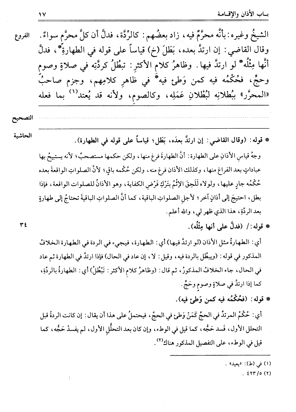 الشَّيْخُ وَغَيْرُهُ: بِأَنَّهُ مُحَرَّمٌ فِيهِ، زَادَ بَعْضُهُمْ كَالرِّدَّةِ، فَدَلَّ أَنَّ كُلَّ مُحَرَّمٍ سَوَاءٌ. وَقَالَ الْقَاضِي إنْ: ارْتَدَّ بَعْدَهُ بَطَلَ "خ" قِيَاسًا عَلَى قَوْلِهِ فِي الطَّهَارَةِ، فَدَلَّ أَنَّهَا مِثْلُهُ لَوْ ارْتَدَّ فِيهَا، وَظَاهِرُ كَلَامِ الْأَكْثَرِ يَبْطُلُ كَرِدَّتِهِ فِي صَلَاةٍ وَصَوْمٍ وَحَجٍّ، فَحُكْمُهُ فِيهِ كَمَنْ وَطِئَ فِيهِ فِي ظَاهِرِ كَلَامِهِمْ، وَجَزَمَ صَاحِبُ الْمُحَرَّرِ بِبُطْلَانِهِ لِبُطْلَانِ عَمَلِهِ، وَكَالصَّوْمِ، وَلِأَنَّهُ قد يعتد1 بما فعله