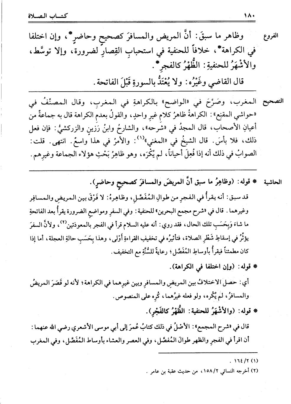 وَظَاهِرُ مَا سَبَقَ أَنَّ الْمَرِيضَ وَالْمُسَافِرَ كَصَحِيحٍ وَحَاضِرٍ، وَإِنْ اخْتَلَفَا فِي الْكَرَاهَةِ، خِلَافًا لِلْحَنَفِيَّةِ فِي اسْتِحْبَابِ الْقِصَارِ لِضَرُورَةٍ، وَإِلَّا تَوَسَّطَ، وَالْأَشْهَرُ لِلْحَنَفِيَّةِ: الظُّهْرُ كَالْفَجْرِ.