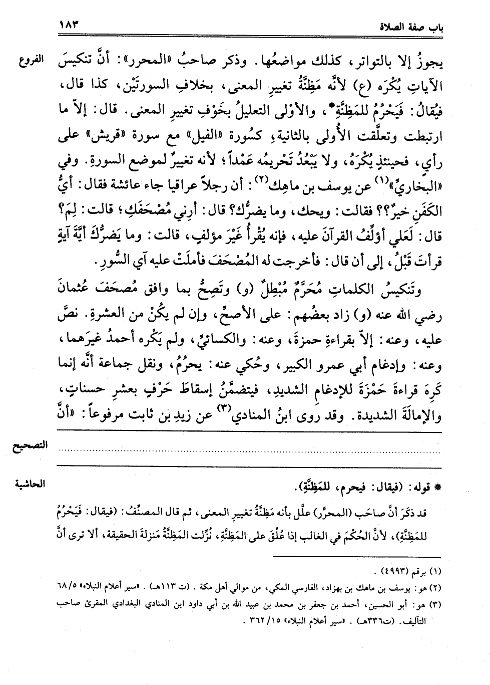 وَتَنْكِيسُ الْكَلِمَاتِ مُحَرَّمٌ مُبْطِلٌ "و" وَتَصِحُّ بِمَا وَافَقَ مُصْحَفَ عُثْمَانَ رَضِيَ اللَّهُ عَنْهُ "و" زَادَ بَعْضُهُمْ عَلَى الْأَصَحِّ، وَإِنْ لَمْ يَكُنْ مِنْ الْعَشَرَةِ نَصَّ عَلَيْهِ، وَعَنْهُ إلَّا بِقِرَاءَةِ حَمْزَةَ، وَعَنْهُ وَالْكِسَائِيِّ، وَلَمْ يَكْرَهْ أَحْمَدُ غَيْرَهُمَا، وَعَنْهُ وَإِدْغَامُ أَبِي عَمْرٍو الْكَبِيرِ، وَحُكِيَ عَنْهُ يَحْرُمُ، وَنَقَلَ جَمَاعَةٌ أَنَّهُ إنَّمَا كَرِهَ قِرَاءَةَ حَمْزَةَ لِلْإِدْغَامِ الشَّدِيدِ، فَيَتَضَمَّنُ إسْقَاطَ حَرْفٍ بِعَشْرِ حَسَنَاتٍ، وَالْإِمَالَةُ الشَّدِيدَةُ. وَقَدْ رَوَى ابْنُ الْمُنَادِي3 عَنْ زَيْدِ بْنِ ثابت مرفوعا: "أن