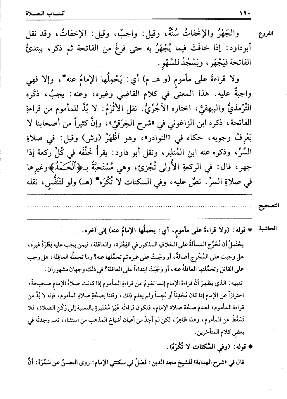 وَلَا قِرَاءَةَ عَلَى مَأْمُومٍ "وهـ م" أَيْ يَحْمِلُهَا الْإِمَامُ عَنْهُ، وَإِلَّا فَهِيَ وَاجِبَةٌ عَلَيْهِ. هَذَا الْمَعْنَى فِي كَلَامِ الْقَاضِي وَغَيْرِهِ، وَعَنْهُ يَجِبُ، ذَكَرَهُ التِّرْمِذِيُّ وَالْبَيْهَقِيُّ، اخْتَارَهُ الْآجُرِّيُّ نَقَلَ الْأَثْرَمُ لَا بُدَّ لِلْمَأْمُومِ مِنْ قِرَاءَةِ الْفَاتِحَةِ، ذَكَرَهُ ابْنُ الزَّاغُونِيِّ فِي شَرْحِ الْخِرَقِيِّ، وَإِنَّ كَثِيرًا مِنْ أَصْحَابِنَا لَا يَعْرِفُ وُجُوبَهُ، حَكَاهُ فِي النَّوَادِرِ، وَهُوَ أَظْهَرُ "وش" وَقِيلَ فِي صَلَاةِ السِّرِّ، وَذَكَرَهُ عَنْهُ ابْنُ الْمُنْذِرِ، وَنَقَلَ أَبُو دَاوُد يَقْرَأُ خَلْفَهُ فِي كُلِّ رَكْعَةٍ إذَا جَهَرَ، قَالَ فِي الرَّكْعَةِ الْأُولَى تُجْزِئُ، وَهِيَ مستحبة بـ {الْحَمْدُ} وَغَيْرِهَا فِي صَلَاةِ السِّرِّ: نَصَّ عَلَيْهِ، وَفِي السَّكَتَاتِ لَا تُكْرَهْ "هـ" وَلَوْ لِنَفَسٍ، نَقَلَهُ