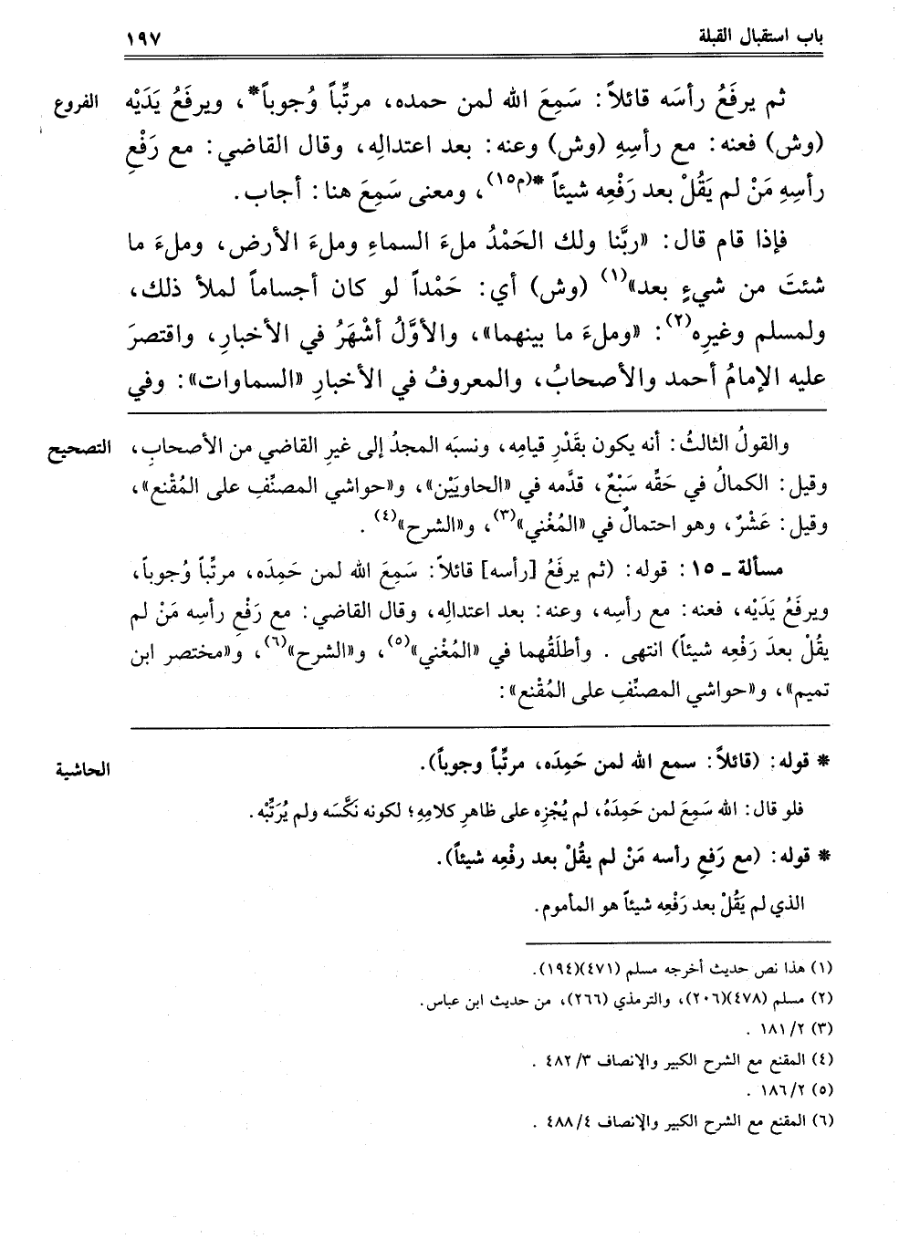 مَسْأَلَةٌ 15: قَوْلُهُ ثُمَّ يَرْفَعُ قَائِلًا سَمِعَ اللَّهُ لِمَنْ حَمِدَهُ، مُرَتِّبًا وُجُوبًا وَيَرْفَعُ يَدَيْهِ فَعَنْهُ مَعَ رَأْسِهِ، وَعَنْهُ بَعْدَ اعْتِدَالِهِ. وَقَالَ الْقَاضِي مَعَ رَفْعِ رَأْسِهِ مَنْ لَمْ يَقُلْ بَعْدَ رَفْعِهِ شَيْئًا، انْتَهَى، وَأَطْلَقَهُمَا فِي الْمُغْنِي5، وَالشَّرْحِ6، وَمُخْتَصَرِ ابْنِ تَمِيمٍ، وَحَوَاشِي الْمُصَنِّفِ عَلَى الْمُقْنِعِ: