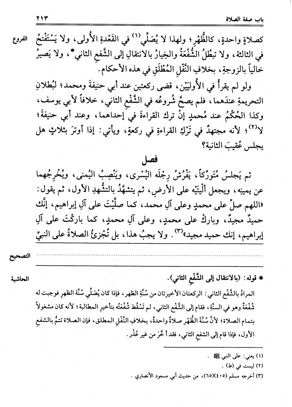 يَفْرِشُ رِجْلَهُ الْيُسْرَى، وَيَنْصِبُ الْيُمْنَى، وَيُخْرِجُهُمَا عَنْ يَمِينِهِ، وَيَجْعَلُ أَلْيَتَيْهِ عَلَى الْأَرْضِ، ثُمَّ يَتَشَهَّدُ بِالتَّشَهُّدِ الْأَوَّلِ، ثُمَّ يَقُولُ: "اللَّهُمَّ صَلِّ عَلَى مُحَمَّدٍ، وَعَلَى آلِ مُحَمَّدٍ، كَمَا صَلَّيْت عَلَى آلِ إبْرَاهِيمَ إنَّك حَمِيدٌ مَجِيدٌ، وَبَارِكْ عَلَى مُحَمَّدٍ، وَعَلَى آلِ مُحَمَّدٍ كَمَا بَارَكْت عَلَى آلِ إبْرَاهِيمَ إنَّك حَمِيدٌ مَجِيدٌ" 3. وَلَا يَجِبُ هَذَا، بَلْ تُجْزِئُ الصلاة على النبي