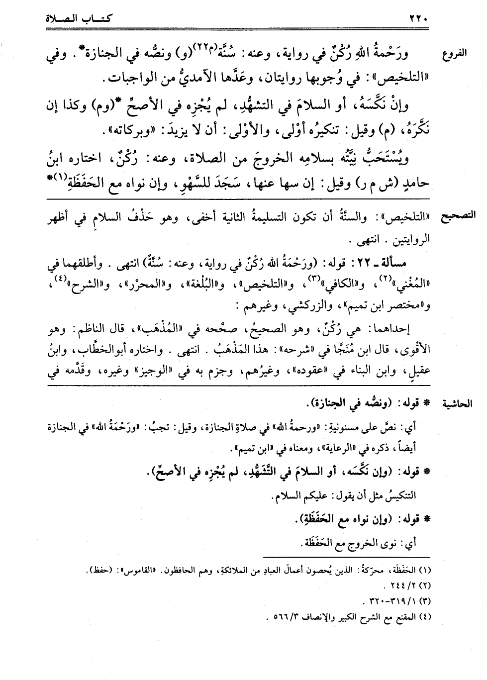 مَسْأَلَةٌ 22: قَوْلُهُ، وَرَحْمَةُ اللَّهِ رُكْنٌ فِي رِوَايَةٍ، وَعَنْهُ سُنَّةٌ، انْتَهَى، وَأَطْلَقَهُمَا فِي الْمُغْنِي2، وَالْكَافِي3، وَالتَّلْخِيصِ، وَالْبُلْغَةِ وَالْمُحَرَّرِ، وَالشَّرْحِ4، وَمُخْتَصَرِ ابْنِ تَمِيمٍ، وَالزَّرْكَشِيِّ وَغَيْرِهِمْ.