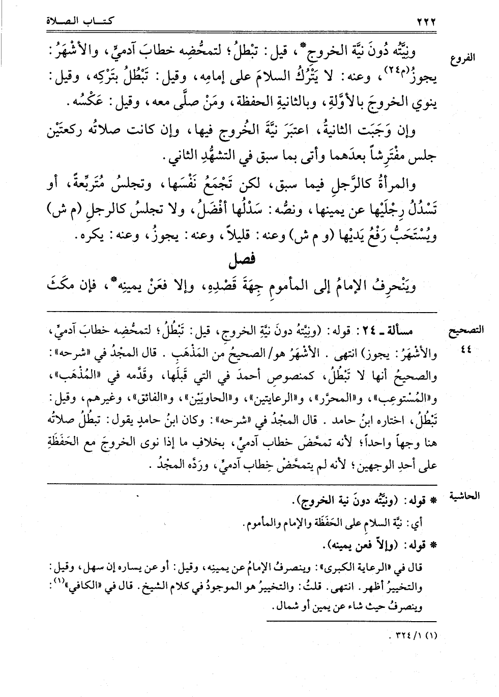 ـــــــــــــــــــــــــــــQمَسْأَلَةٌ 24: وَنِيَّتُهُ دُونَ نِيَّةِ الْخُرُوجِ قِيلَ تَبْطُلُ، لِتَمَحُّضِهِ خِطَابَ آدَمِيٍّ، وَالْأَشْهَرُ هُوَ الصَّحِيحُ مِنْ الْمَذْهَبِ، قَالَ الْمَجْدُ فِي شَرْحِهِ: وَالصَّحِيحُ أَنَّهَا لَا تَبْطُلُ، كَمَنْصُوصِ أَحْمَدَ فِي الَّتِي قَبْلِهَا، وَقَدَّمَهُ فِي الْمُذْهَبِ، وَالْمُسْتَوْعِبِ وَالْمُحَرَّرِ وَالرِّعَايَتَيْنِ، وَالْحَاوِيَيْنِ، وَالْفَائِقِ وَغَيْرِهِمْ، وَقِيلَ تَبْطُلُ، اخْتَارَهُ ابْنُ حَامِدٍ، قَالَ الْمَجْدُ فِي شَرْحِهِ: وَكَانَ ابْنُ حَامِدٍ يَقُولُ تَبْطُلُ صَلَاتُهُ هُنَا، وَجْهًا وَاحِدًا، لِأَنَّهُ تمحض خِطَابِ آدَمِيٍّ، بِخِلَافِ مَا إذَا نَوَى الْخُرُوجَ مَعَ الْحَفَظَةِ عَلَى أَحَدِ الْوَجْهَيْنِ، لِأَنَّهُ لَمْ يتمحض خطاب آدمي، ورده المجد.