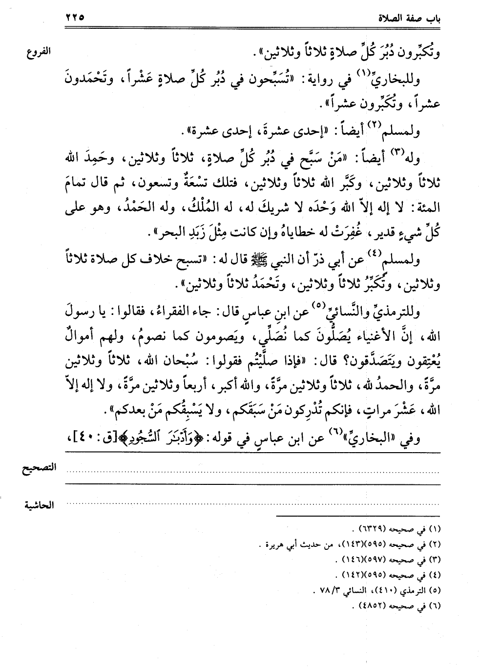 وَلِلتِّرْمِذِيِّ وَالنَّسَائِيُّ5 عَنْ ابْنِ عَبَّاسٍ قَالَ: جَاءَ الْفُقَرَاءُ، فَقَالُوا: يَا رَسُولَ اللَّهِ إنَّ الْأَغْنِيَاءَ يُصَلُّونَ كَمَا نُصَلِّي، وَيَصُومُونَ كَمَا نَصُومُ، وَلَهُمْ أَمْوَالٌ يُعْتِقُونَ وَيَتَصَدَّقُونَ؟ قَالَ: فَإِذَا صَلَّيْتُمْ فَقُولُوا: "سُبْحَانَ اللَّهِ ثَلَاثًا وَثَلَاثِينَ مَرَّةً، وَالْحَمْدُ لِلَّهِ ثَلَاثًا وَثَلَاثِينَ مَرَّةً، وَاَللَّهُ أَكْبَرُ أَرْبَعًا وَثَلَاثِينَ مَرَّةً، وَلَا إلَهَ إلَّا اللَّهُ عَشْرَ مَرَّاتٍ فَإِنَّكُمْ تُدْرِكُونَ مَنْ سَبَقَكُمْ، وَلَا يَسْبِقُكُمْ مَنْ بَعْدَكُمْ".