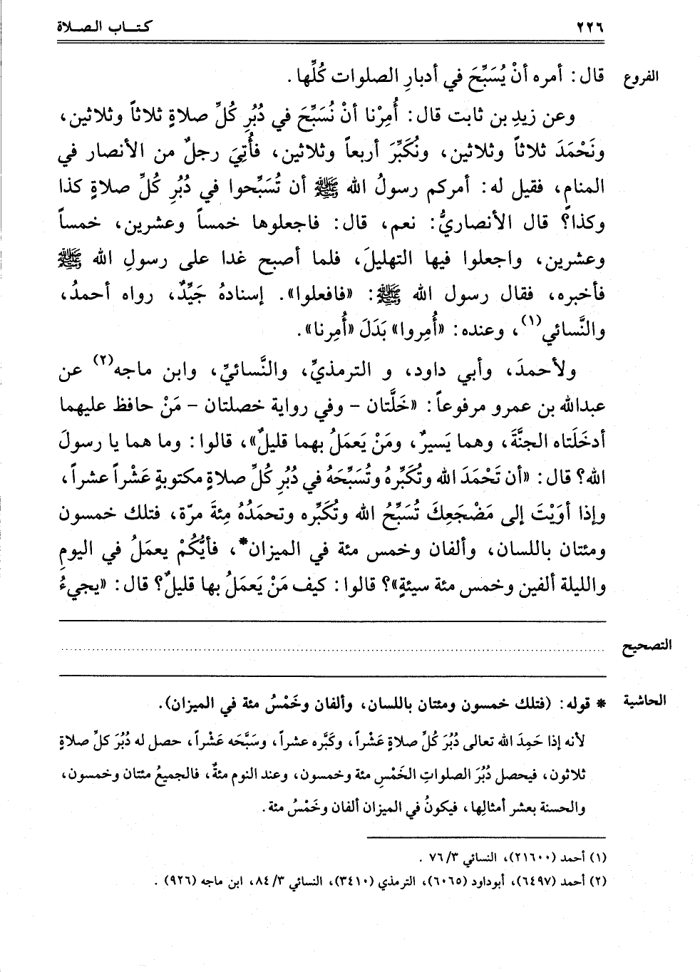 وَلِأَحْمَدَ وَأَبِي دَاوُد وَالتِّرْمِذِيِّ وَالنَّسَائِيُّ وَابْنِ مَاجَهْ2 عَنْ عَبْدِ اللَّهِ بْنِ عُمَرَ مَرْفُوعًا "خَلَّتَانِ" وَفِي رِوَايَةٍ "خَصْلَتَانِ مَنْ حَافَظَ عَلَيْهِمَا أَدْخَلَتَاهُ الْجَنَّةَ وَهُمَا يَسِيرٌ، وَمَنْ يَعْمَلُ بِهِمَا قَلِيلٌ" قَالُوا وَمَا هُمَا يَا رَسُولَ اللَّهِ قَالَ: "أَنْ تَحْمَدَ اللَّهَ وَتُكَبِّرَهُ وَتُسَبِّحَهُ فِي دُبُرِ كُلِّ صَلَاةٍ مَكْتُوبَةٍ عَشْرًا عَشْرًا، وَإِذَا أَوَيْت إلَى مَضْجَعِك تُسَبِّحُ اللَّهَ وَتُكَبِّرُهُ وَتَحْمَدُهُ مِائَةً، فَتِلْكَ خَمْسُونَ وَمِائَتَانِ بِاللِّسَانِ، وَأَلْفَانِ وَخَمْسُمِائَةٍ فِي الْمِيزَانِ فَأَيُّكُمْ يَعْمَلُ فِي الْيَوْمِ وَاللَّيْلَةِ أَلْفَيْنِ وَخَمْسَمِائَةِ سَيِّئَةٍ"؟ قَالُوا: كَيْفَ مَنْ يَعْمَلُ بِهِمَا قليل؟ قال: "يجيء