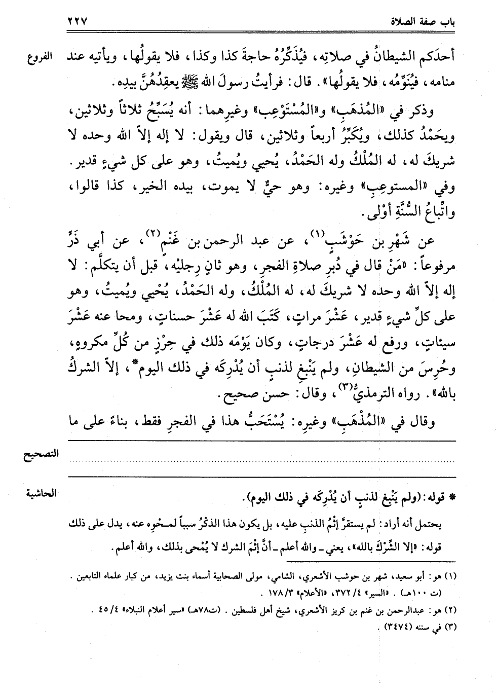 وَعَنْ شَهْرِ بْنِ حَوْشَبٍ1 عَنْ عَبْدِ الرَّحْمَنِ بْنِ غَنْمٍ2، وَعَنْ أَبِي ذَرٍّ مَرْفُوعًا: "مَنْ قَالَ فِي دُبُرِ صَلَاةِ الْفَجْرِ وَهُوَ ثَانِي رِجْلَيْهِ قَبْلَ أَنْ يَتَكَلَّمَ لَا إلَهَ إلَّا اللَّهُ وَحْدَهُ لَا شَرِيكَ لَهُ، لَهُ الْمُلْكُ وَلَهُ الْحَمْدُ يُحْيِي وَيُمِيتُ وَهُوَ عَلَى كُلِّ شَيْءٍ قَدِيرٌ عَشْرَ مَرَّاتٍ كَتَبَ اللَّهُ لَهُ عَشْرَ حَسَنَاتٍ، وَمَحَا عَنْهُ عَشْرَ سَيِّئَاتٍ، وَرَفَعَ لَهُ عَشْرَ دَرَجَاتٍ، وَكَانَ يَوْمُهُ ذَلِكَ فِي حِرْزٍ مِنْ كُلِّ مَكْرُوهٍ، وَحُرِسَ مِنْ الشَّيْطَانِ، وَلَمْ يَنْبَغِ لِذَنْبٍ أَنْ يُدْرِكَهُ فِي ذَلِكَ الْيَوْمِ إلَّا الشِّرْكُ بِاَللَّهِ". رَوَاهُ التِّرْمِذِيُّ3. وَقَالَ حَسَنٌ صَحِيحٌ.