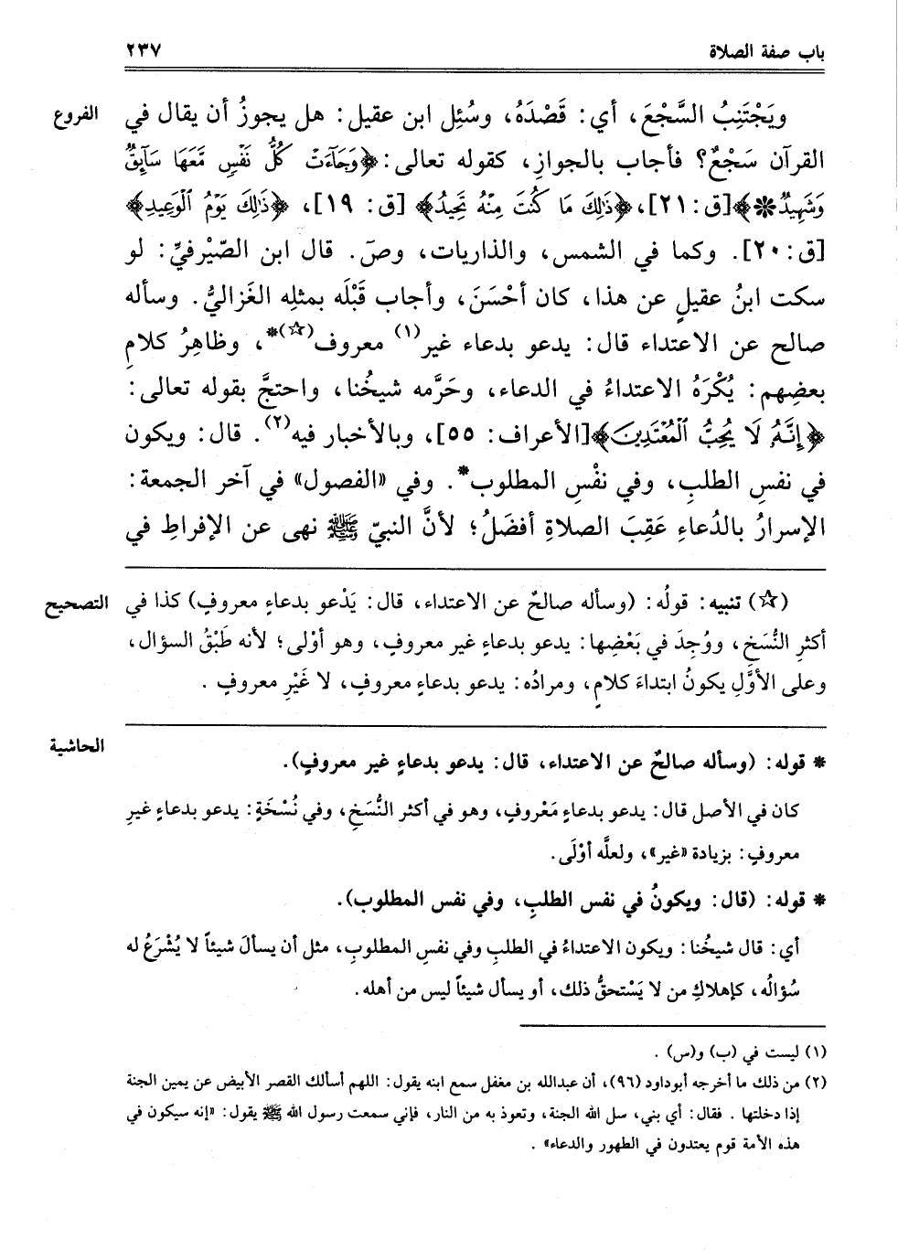 2 من ذلك ما أخرجه أبو داود "96" أن عبد الله بن مغفل سمع ابنه يقول: اللهم أسألك القصر الأبيض عن يمين الجنة إذا دخلتها. فقال: أي بني سل الله الجنة وتعوذ به من النار فإني سَمِعْت رَسُولَ اللَّهِ صَلَّى اللَّهُ عَلَيْهِ وَسَلَّمَ يقول: "إنه سيكون في هذه الأمة قوم يعتدون في الطهور والدعاء".
