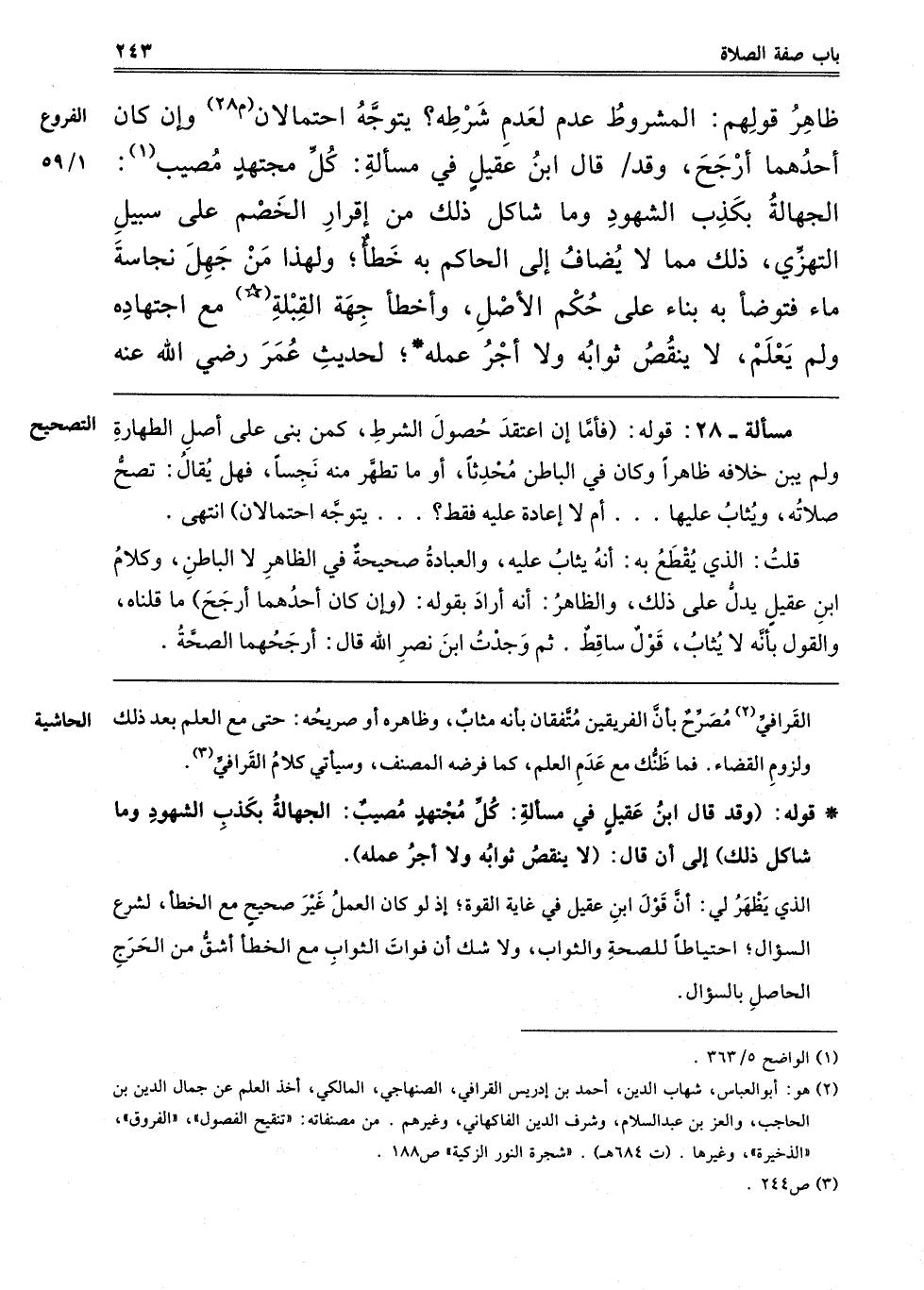 ظَاهِرُ قَوْلِهِمْ: الْمَشْرُوطِ عَدَمُهُ لِعَدَمِ شَرْطِهِ؟ يَتَوَجَّهُ احتمالان "م 28" وإن كان أَحَدُهُمَا أَرْجَحَ، وَقَدْ قَالَ ابْنُ عَقِيلٍ فِي مَسْأَلَةِ كُلُّ مُجْتَهِدٍ مُصِيبٌ1: الْجَهَالَةُ بِكَذِبِ الشُّهُودِ وَمَا شَاكَلَ ذَلِكَ مِنْ إقْرَارِ الْخَصْمِ عَلَى سَبِيلِ التَّهَزِّي ذَلِكَ مِمَّا لَا يُضَافُ إلَى الْحَاكِمِ بِهِ خَطَأً، وَلِهَذَا مَنْ جَهِلَ نَجَاسَةَ مَاءٍ فَتَوَضَّأَ بِهِ بِنَاءً عَلَى حُكْمِ الْأَصْلِ، أَوْ أَخْطَأَ جِهَةَ الْقِبْلَةِ مَعَ اجْتِهَادِهِ وَلَمْ يَعْلَمْ، لَا يَنْقُصُ ثَوَابُهُ وَلَا أَجْرُ عَمَلِهِ لحديث عمر رضي الله عنه