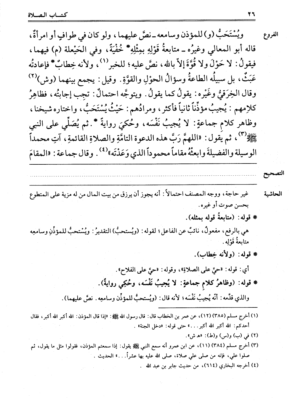 وَيُسْتَحَبُّ "و" لِلْمُؤَذِّنِ وَسَامِعِهِ نَصَّ عَلَيْهِمَا وَلَوْ كَانَ فِي طَوَافٍ أَوْ امْرَأَةٍ قَالَ أَبُو الْمَعَالِي وَغَيْرُهُ مُتَابَعَةَ قَوْلِهِ بِمِثْلِهِ خُفْيَةً، وَفِي الْحَيْعَلَةِ "م" فِيهِمَا فَيَقُولُ: لَا حَوْلَ وَلَا قُوَّةَ إلَّا بِاَللَّهِ، نَصَّ عَلَيْهِ لِلْخَبَرِ1، وَلِأَنَّهُ خِطَابٌ فَإِعَادَتُهُ عَبَثٌ، بَلْ سَبِيلُهُ الطَّاعَةُ وَسُؤَالُ الحول والقوة، وقيل يجمع بينهما "وش"2 وَقَالَ الْخِرَقِيُّ وَغَيْرُهُ: يَقُولُ كَمَا يَقُولُ، وَيُتَوَجَّهُ احْتِمَالٌ تَجِبُ إجَابَتُهُ، فَظَاهِرُ كَلَامِهِمْ يُجِيبُ مُؤَذِّنًا ثَانِيًا فَأَكْثَرَ، وَمُرَادُهُمْ حَيْثُ يُسْتَحَبُّ، وَاخْتَارَهُ شَيْخُنَا، وَظَاهِرُ كَلَامِ جَمَاعَةٍ لَا يُجِيبُ نَفْسَهُ، وَحَكَى رِوَايَةً ثُمَّ يُصَلِّي عَلَى النَّبِيِّ صَلَّى اللَّهُ عَلَيْهِ وَسَلَّمَ3، ثُمَّ يَقُولُ: "اللَّهُمَّ رَبَّ هَذِهِ الدَّعْوَةِ التَّامَّةِ وَالصَّلَاةِ الْقَائِمَةِ آتِ مُحَمَّدًا الْوَسِيلَةَ وَالْفَضِيلَةَ وَابْعَثْهُ مَقَامًا مَحْمُودًا الَّذِي وَعَدْته4" وَقَالَ جماعة: المقام