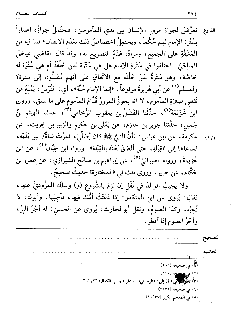تَعَرَّضَ لِجَوَازِ مُرُورِ الْإِنْسَانِ بَيْنَ يَدَيْ الْمَأْمُومِينَ، فَيَحْتَمِلُ جَوَازُهُ اعْتِبَارًا بِسُتْرَةِ الْإِمَامِ لَهُمْ حُكْمًا، وَيَحْتَمِلُ اخْتِصَاصُ ذَلِكَ بِعَدَمِ الْإِبْطَالِ، لِمَا فِيهِ مِنْ الْمَشَقَّةِ عَلَى الْجَمِيعِ، وَمُرَادُهُ عَدَمُ التَّصْرِيحِ بِهِ، وَقَدْ قَالَ الْقَاضِي عِيَاضٌ الْمَالِكِيُّ: اخْتَلَفُوا هَلْ سُتْرَةُ الْإِمَامِ سُتْرَةٌ لِمَنْ خَلْفَهُ أَمْ هِيَ سُتْرَةٌ لَهُ خَاصَّةً وَهُوَ سُتْرَةٌ لِمَنْ خَلْفَهُ مَعَ الِاتِّفَاقِ أَنَّهُمْ مُصَلُّونَ إلَى سُتْرَةٍ وَلِمُسْلِمٍ1 عَنْ أَبِي هُرَيْرَةَ مَرْفُوعًا "إنَّمَا الْإِمَامُ جُنَّةٌ". أَيْ التُّرْسُ، يَمْنَعُ مِنْ نَقْصِ صَلَاةِ الْمَأْمُومِ، لَا أَنَّهُ يُجَوِّزُ الْمُرُورَ قُدَّامَ الْمَأْمُومِ كَمَا سَبَقَ، وَرَوَى ابْنُ خُزَيْمَةَ2 حَدَّثَنَا الْفَضْلُ بن يعقوب الرخامي3، حَدَّثَنَا الْهَيْثَمُ بْنُ جَمِيلٍ، حَدَّثَنَا جَرِيرُ بْنُ حَازِمٍ، عَنْ يَعْلَى بْنِ حَكِيمٍ وَالزُّبَيْرِ بْنِ خِرِّيتٍ، عَنْ عِكْرِمَةَ، عَنْ ابْنِ عَبَّاسٍ: "أَنَّ النَّبِيَّ صَلَّى اللَّهُ عَلَيْهِ وَسَلَّمَ كَانَ يُصَلِّي، فَمَرَّتْ شَاةٌ بَيْنَ يَدَيْهِ، فَسَاعَاهَا إلَى الْقِبْلَةِ، حَتَّى أَلْصَقَ بَطْنَهُ بِالْقِبْلَةِ". رَوَاهُ ابْنُ حِبَّانَ4، عَنْ ابْنِ خُزَيْمَةَ، وَرَوَاهُ الطَّبَرَانِيُّ5، عَنْ إبْرَاهِيمَ بْنِ صَالِحٍ الشِّيرَازِيِّ، عَنْ عُمَرَ بْنِ حَكَّامٍ، عَنْ جَرِيرٍ، وَرُوِيَ ذَلِكَ فِي الْمُخْتَارَةِ حَدِيثٌ صَحِيحٌ.