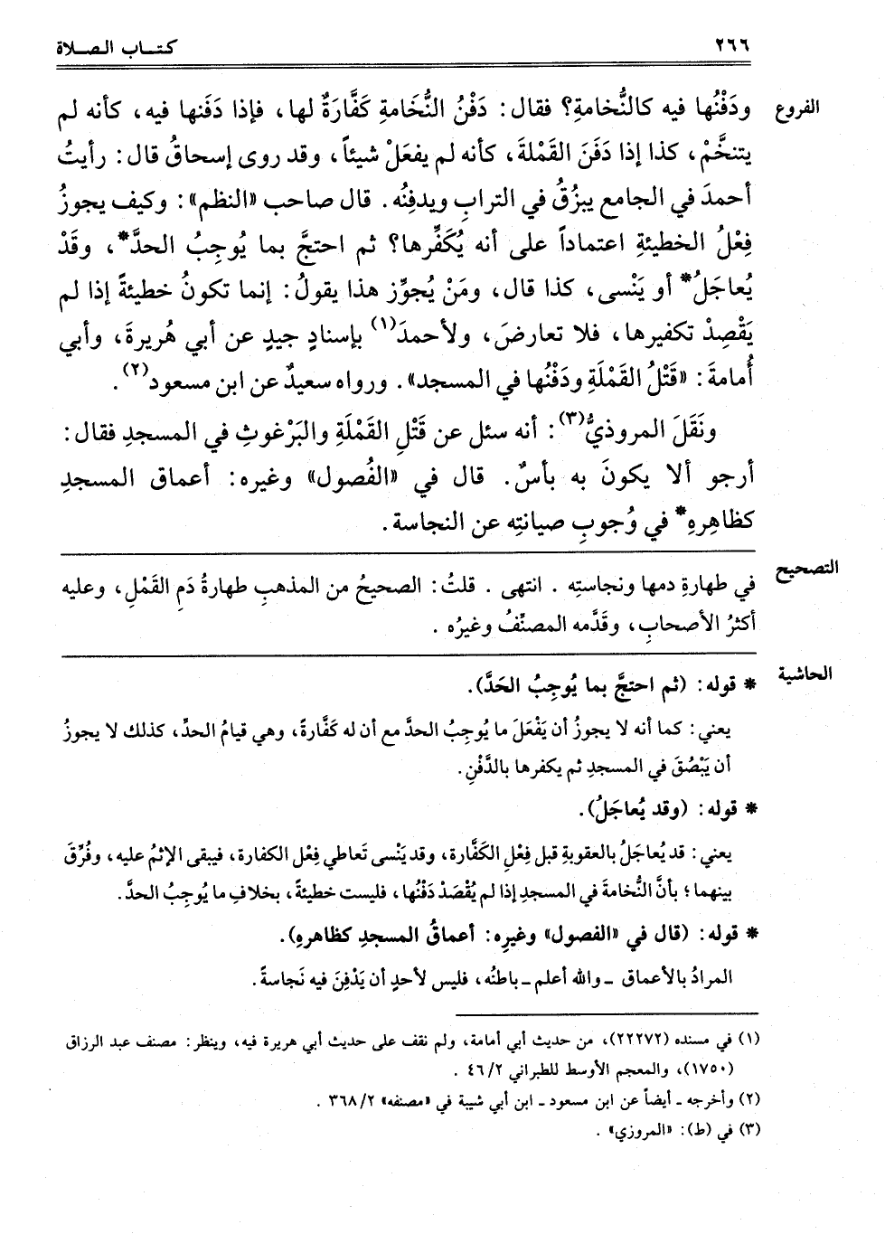 وَدَفْنُهَا فِيهِ كَالنُّخَامَةِ؟ فَقَالَ: دَفْنُ النُّخَامَةِ كَفَّارَةٌ لَهَا، فَإِذَا دَفَنَهَا كَأَنَّهُ لَمْ يَتَنَخَّمْ، كَذَا إذَا دَفَنَ الْقَمْلَةَ كَأَنَّهُ لَمْ يَفْعَلْ شَيْئًا، وَقَدْ رَوَى إِسْحَاقُ قَالَ: رَأَيْت أَحْمَدَ فِي الْجَامِعِ يَبْزُقُ فِي التُّرَابِ وَيَدْفِنُهُ، قَالَ صَاحِبُ النَّظْمِ: وَكَيْفَ يَجُوزُ فِعْلُ الْخَطِيئَةِ اعْتِمَادًا عَلَى أَنَّهُ يُكَفِّرُهَا؟ ثُمَّ احْتَجَّ بِمَا يُوجِبُ حَدًّا، وَقِيلَ يُعَالِجُ أَوْ يَنْسَى، كَذَا قَالَ، وَمَنْ يُجَوِّزُ هَذَا يَقُولُ: إنَّمَا يَكُونُ خَطِيئَةً إذَا لَمْ يَقْصِدْ تَكْفِيرَهَا، فَلَا تَعَارُضَ، وَلِأَحْمَدَ1 بِإِسْنَادٍ جَيِّدٍ عَنْ أَبِي هُرَيْرَةَ وَأَبِي أُمَامَةَ "قَتْلُ الْقَمْلَةِ وَدَفْنُهَا فِي الْمَسْجِدِ" رَوَاهُ سَعِيدٌ عَنْ ابن مسعود2.