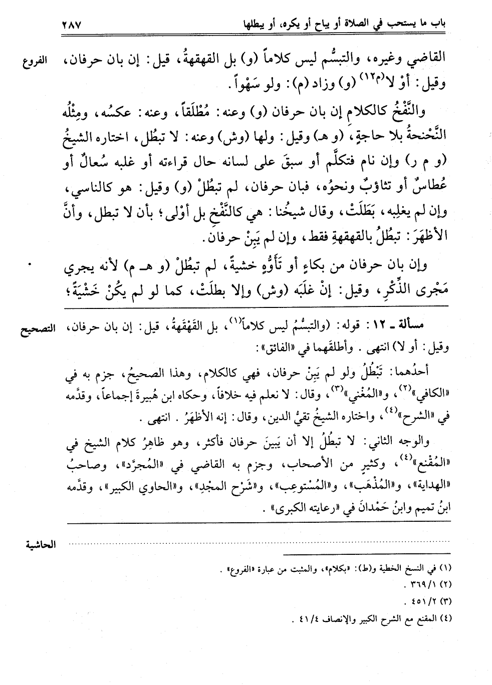 ـــــــــــــــــــــــــــــQمسألة 12" قوله: والتبسم ليس كلاما1، بَلْ الْقَهْقَهَةُ، قِيلَ إنْ أَبَانَ حَرْفَيْنِ وَقِيلَ أَوْ لَا، انْتَهَى، وَأَطْلَقَهُمَا فِي الْفَائِقِ.