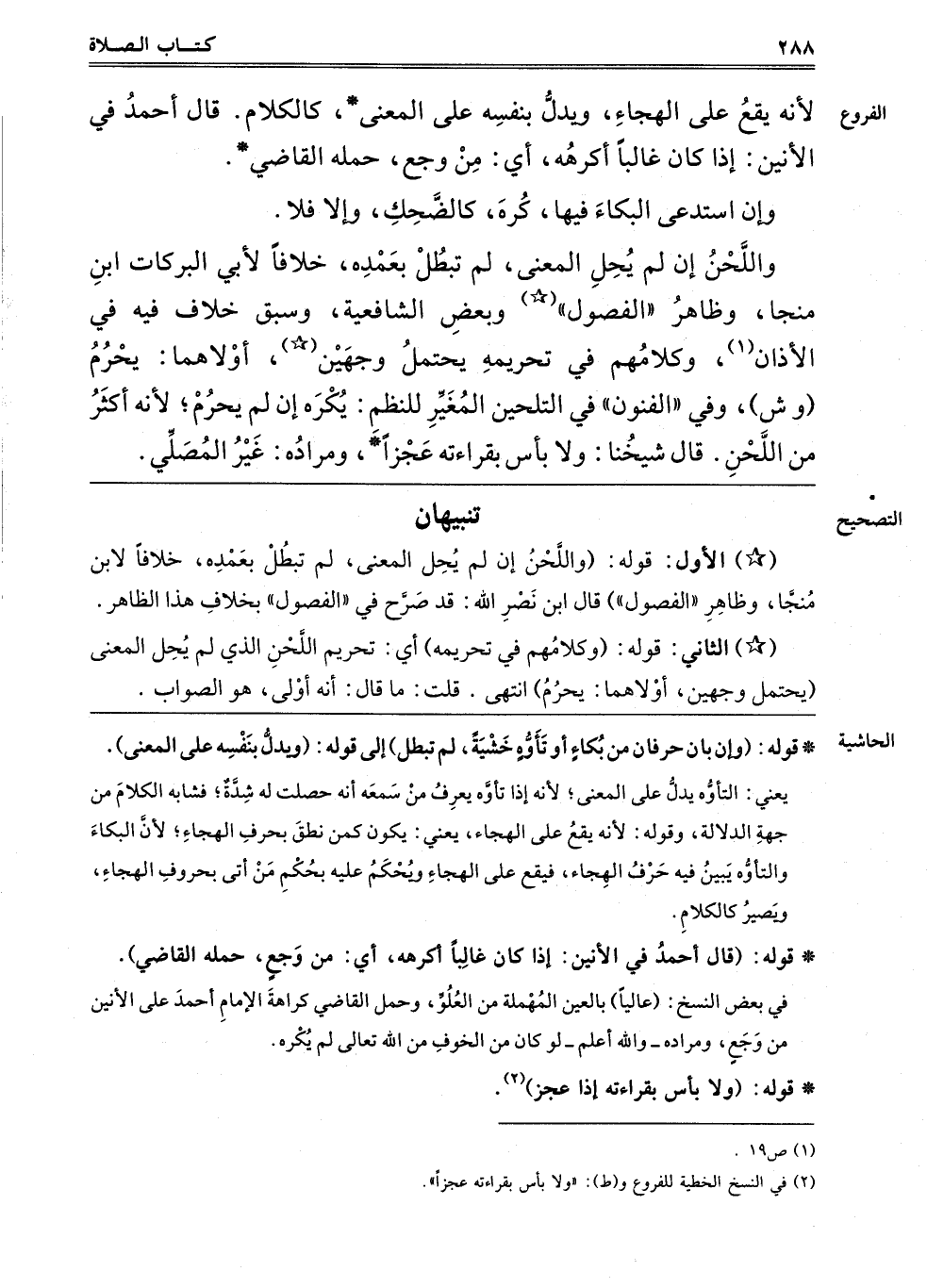 الْأَوَّلُ: قَوْلُهُ: وَاللَّحْنُ إنْ لَمْ يُحِلَّ الْمَعْنَى لَمْ تَبْطُلْ بِعَمْدِهِ، خِلَافًا لِابْنِ مُنَجَّى، وَظَاهِرُ الْفُصُولِ، قَالَ ابْنُ نَصْرِ اللَّهِ قَدْ صَرَّحَ فِي الْفُصُولِ بِخِلَافِ هَذَا الظَّاهِرِ.