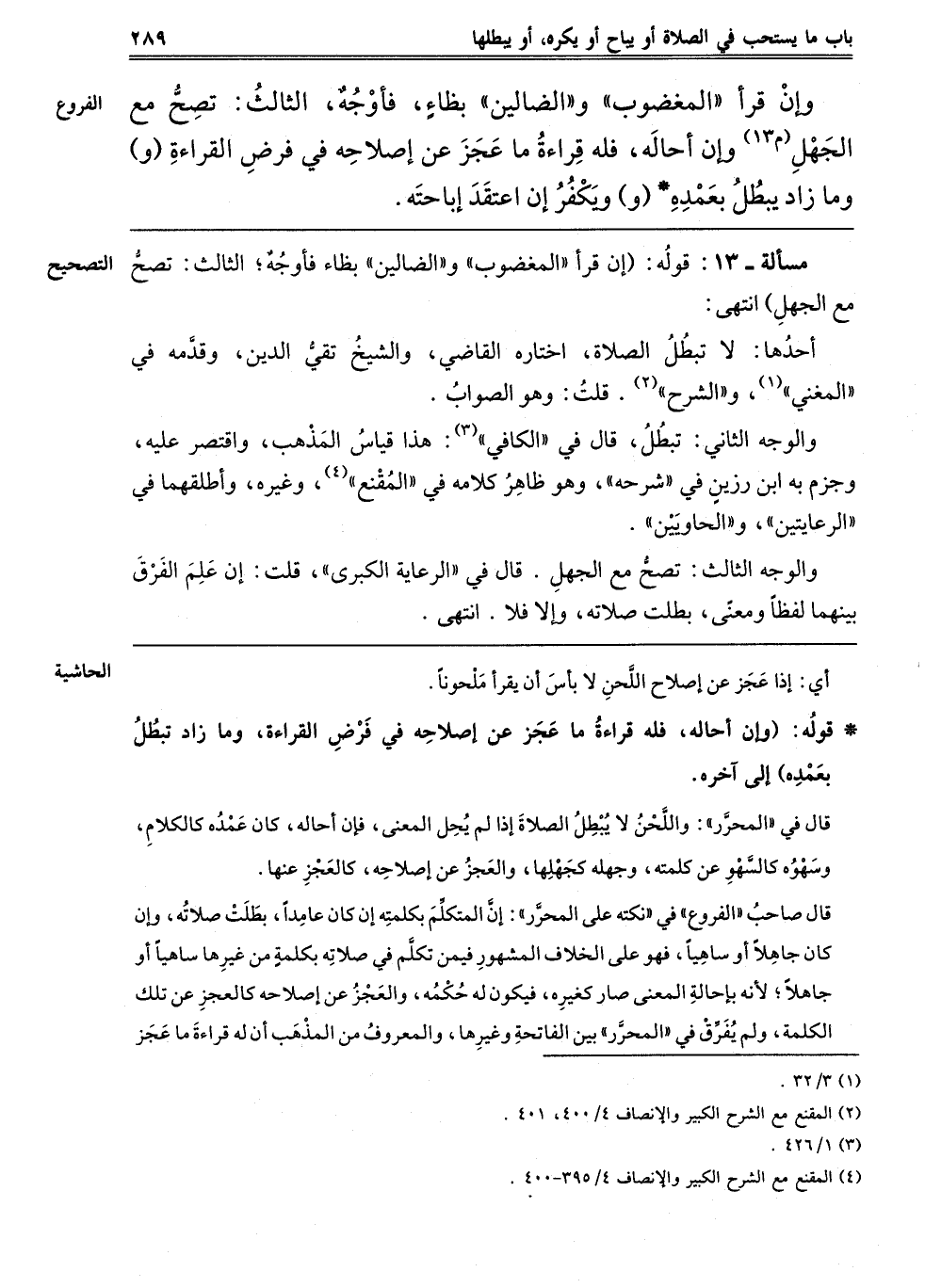 ـــــــــــــــــــــــــــــQمَسْأَلَةٌ 13: إنْ قَرَأَ الْمَغْضُوبِ وَالضَّالِّينَ بِظَاءٍ فَأَوْجُهٌ؛ الثَّالِثُ يَصِحُّ مَعَ الْجَهْلِ، انْتَهَى: أَحَدُهَا: لَا تَبْطُلُ الصَّلَاةُ، اخْتَارَهُ الْقَاضِي، وَالشَّيْخُ تَقِيُّ الدِّينِ، وَقَدَّمَهُ فِي الْمُغْنِي1، وَالشَّرْحِ2 "قُلْتُ" وَهُوَ الصَّوَابُ، وَالْوَجْهُ الثَّانِي تَبْطُلُ، قَالَ فِي الْكَافِي3 هَذَا قِيَاسُ الْمَذْهَبِ، وَاقْتَصَرَ عَلَيْهِ، وَجَزَمَ بِهِ ابْنُ رَزِينٍ فِي شَرْحِهِ، وَهُوَ ظَاهِرُ كَلَامِهِ فِي الْمُقْنِعِ4، وَغَيْرِهِ، وَأَطْلَقَهُمَا فِي الرِّعَايَتَيْنِ، وَالْحَاوِيَيْنِ، وَالْوَجْهُ الثَّالِثُ تَصِحُّ مَعَ الْجَهْلِ، قَالَ فِي الرِّعَايَةِ الْكُبْرَى قُلْتُ إنْ عَلِمَ الْفَرْقَ بَيْنَهُمَا لَفْظًا ومعنى بطلت صلاته، وإلا فلا. انتهى.