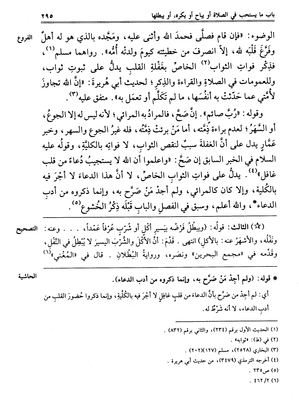 وَقَوْلُهُ: رُبَّ صَائِمٍ. إنْ صَحَّ فَالْمُرَادُ بِهِ الْمُرَائِي، لِأَنَّهُ لَيْسَ لَهُ إلَّا الْجُوعُ، أَوْ السَّهَرُ، لِعَدَمِ بَرَاءَةِ ذِمَّتِهِ، أَمَّا مَنْ بَرِئَتْ ذِمَّتُهُ فَلَهُ غَيْرُ الْجُوعِ وَالسَّهَرِ وَحَدِيثُ عَمَّارٍ يَدُلُّ عَلَى أَنَّ الْغَفْلَةَ سَبَبٌ لِنَقْصِ الثَّوَابِ، لَا فَوَاتِهِ بِالْكُلِّيَّةِ، وَقَوْلُهُ عَلَيْهِ السَّلَامُ فِي الْخَبَرِ السَّابِقِ إنْ صَحَّ: "وَاعْلَمُوا أَنَّ اللَّهَ لَا يَسْتَجِيبُ دُعَاءً مِنْ قَلْبٍ غَافِلٍ" 4. يَدُلُّ عَلَى فَوَاتِ الثَّوَابِ الْخَاصِّ، لَا أَنَّ هَذَا الدُّعَاءَ لَا أَجْرَ فِيهِ بِالْكُلِّيَّةِ، وَإِلَّا كَانَ كَالْمُرَائِي، وَلَمْ أَجِدْ إلَى الْآنَ مَنْ صَرَّحَ بِهِ، وَإِنَّمَا ذَكَرُوهُ مِنْ أَدَبِ الدُّعَاءِ، وَاَللَّهُ أَعْلَمُ وَسَبَقَ فِي الْفَصْلِ والباب قبله ذكر الخشوع5.