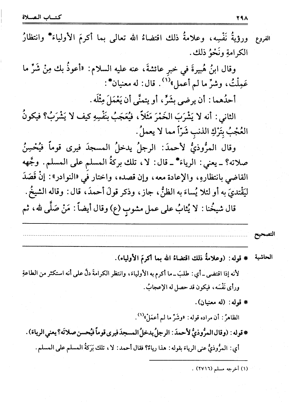 وَرُؤْيَةِ نَفْسِهِ، وَعَلَامَةُ ذَلِكَ اقْتِضَاءُ اللَّهِ تَعَالَى بِمَا أَكْرَمَ بِهِ الْأَوْلِيَاءَ، وَانْتِظَارُ الْكَرَامَةِ وَنَحْوُ ذَلِكَ. وَقَالَ ابْنُ هُبَيْرَةَ فِي خَبَرِ عَائِشَةَ عَنْهُ عَلَيْهِ السَّلَامُ: "أَعُوذُ بِك مِنْ شَرِّ مَا عَمِلْت، وَشَرِّ مَا لَمْ أَعْمَلْ"1. قَالَ: لَهُ مَعْنَيَانِ:
