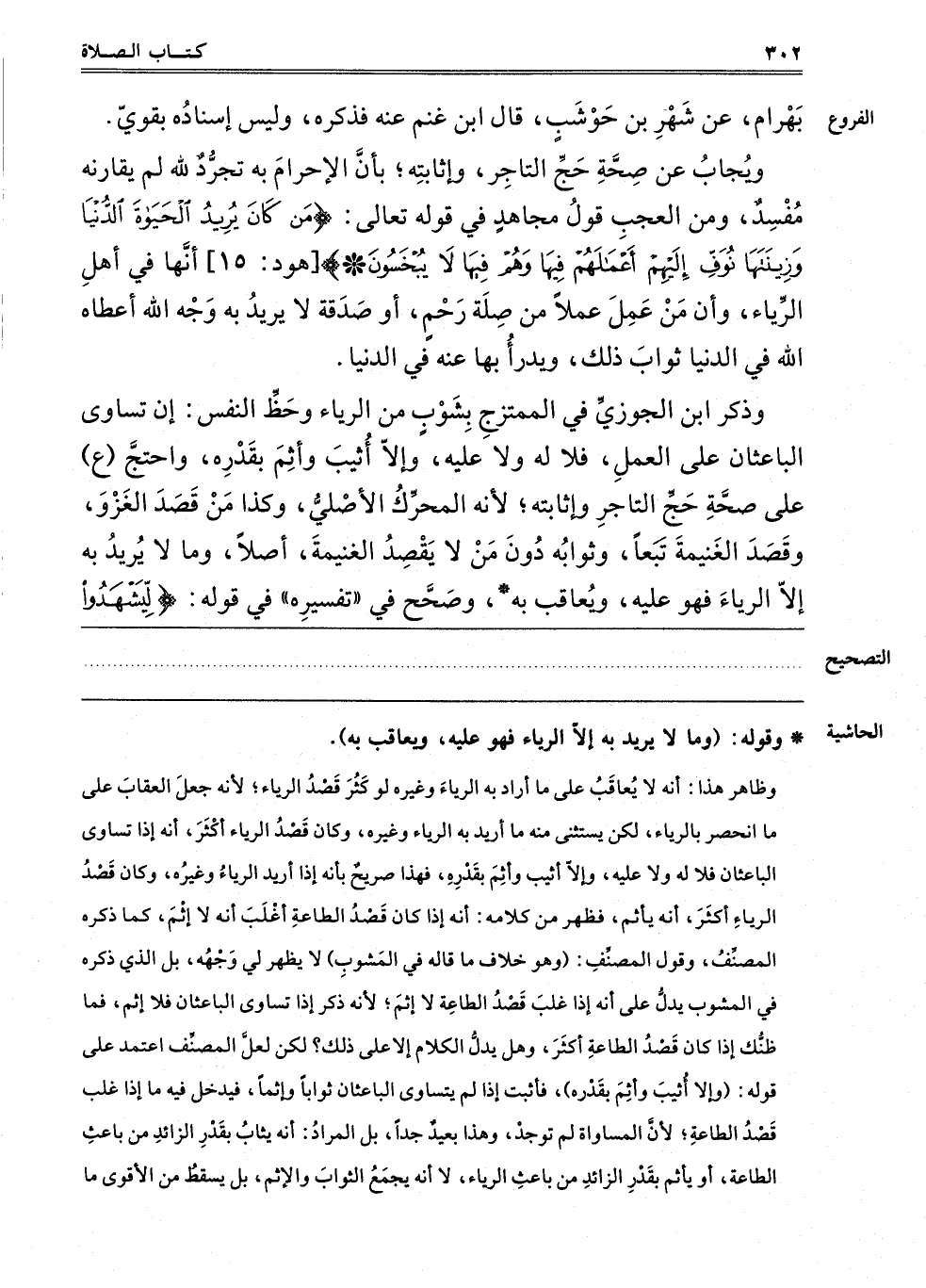 بَهْرَامَ، عَنْ شَهْرِ بْنِ حَوْشَبٍ، قَالَ ابْنُ غَنْمٍ عَنْهُ فَذَكَرَهُ، وَلَيْسَ إسْنَادُهُ بِقَوِيٍّ وَيُجَابُ عَنْ صِحَّةِ حَجِّ التَّاجِرِ وَإِثَابَتِهِ بِأَنَّ الْإِحْرَامَ بِهِ تَجَرُّدٌ لِلَّهِ لَمْ يُقَارِنْهُ مُفْسِدٌ، وَمَنْ الْعَجَبِ قَوْلُ مُجَاهِدٍ فِي قَوْله تَعَالَى: {مَنْ كَانَ يُرِيدُ الْحَيَاةَ الدُّنْيَا وَزِينَتَهَا نُوَفِّ إِلَيْهِمْ أَعْمَالَهُمْ فِيهَا وَهُمْ فِيهَا لا يُبْخَسُونَ} [هود: 15] إنَّهَا فِي أَهْلِ الرِّيَاءِ، وَأَنَّ مَنْ عَمِلَ عَمَلًا مِنْ صِلَةِ رَحِمٍ أَوْ صَدَقَةٍ لَا يُرِيدُ بِهَا وَجْهَ اللَّهِ أَعْطَاهُ اللَّهُ فِي الدُّنْيَا ثَوَابَ ذَلِكَ، وَيَدْرَأُ عَنْهُ فِي الدُّنْيَا، وَذَكَرَ ابْنُ الْجَوْزِيِّ فِي الْمُمْتَزِجِ بِشَوْبٍ مِنْ رِيَاءِ الدُّنْيَا وَحَظِّ النَّفْسِ إنْ تَسَاوَى الْبَاعِثَانِ عَلَى الْعَمَلِ فَلَا لَهُ وَلَا عَلَيْهِ، وَإِلَّا أُثِيبَ وَأَثِمَ بِقَدْرِهِ، وَاحْتَجَّ بِالْإِجْمَاعِ عَلَى صِحَّةِ حَجِّ التَّاجِرِ وَإِثَابَتِهِ، لِأَنَّهُ الْمُحَرِّكُ الْأَصْلِيُّ، وَكَذَا مَنْ قَصَدَ الْغَزْوَ، وَقَصَدَ الْغَنِيمَةَ تَبَعًا، وَثَوَابُهُ دُونَ مَنْ لَا يَقْصِدُ الْغَنِيمَةَ أَصْلًا. وَمَا لَا يُرِيدُ بِهِ إلَّا الرِّيَاءَ فَهُوَ عَلَيْهِ، وَيُعَاقَبُ بِهِ، وَصَحَّحَ فِي تَفْسِيرِهِ فِي قَوْلِهِ: {لِيَشْهَدُوا