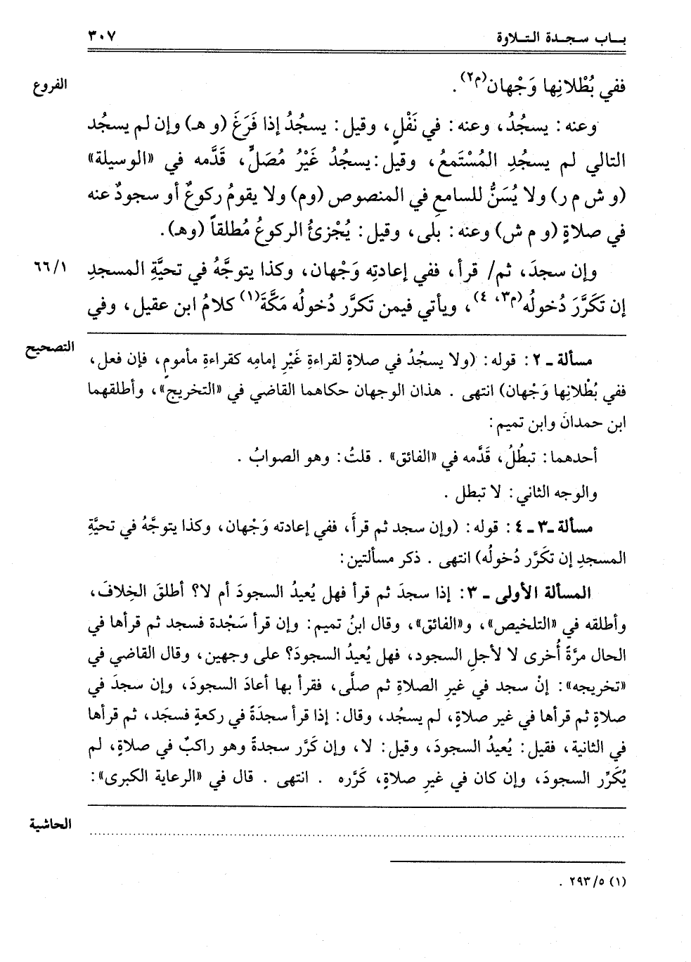 الْمَسْأَلَةُ الْأُولَى -3: إذَا سَجَدَ ثُمَّ قَرَأَ فَهَلْ يُعِيدُ السُّجُودَ أَمْ لَا، أَطْلَقَ الْخِلَافَ، وَأَطْلَقَهُ فِي التَّلْخِيصِ، وَالْفَائِقِ قَالَ ابْنُ تَمِيمٍ وَإِنْ قَرَأَ سَجْدَةً ثُمَّ قَرَأَهَا فِي الْحَالِ مَرَّةً أُخْرَى لَا لِأَجْلِ السُّجُودِ فَهَلْ يُعِيدُ السُّجُودَ؟ عَلَى وَجْهَيْنِ. وَقَالَ الْقَاضِي فِي تَخْرِيجِهِ إنْ سَجَدَ فِي غَيْرِ الصَّلَاةِ ثُمَّ صَلَّى، فَقَرَأَ بِهَا أَعَادَ السُّجُودَ، وَإِنْ سَجَدَ فِي صَلَاةٍ ثُمَّ قَرَأَهَا فِي غَيْرِ صَلَاةٍ لَمْ يَسْجُدْ، وَقَالَ إذَا قَرَأَ سَجْدَةً فِي رَكْعَةٍ فَسَجَدَ، ثُمَّ قَرَأَهَا فِي الثَّانِيَةِ، فَقِيلَ يُعِيدُ السُّجُودَ، وَقِيلَ لَا، وَإِنْ كَرَّرَ سَجْدَةً وَهُوَ رَاكِبٌ فِي صَلَاةٍ لَمْ يُكَرِّرْ السُّجُودَ، وَإِنْ كَانَ فِي غَيْرِ صَلَاةٍ كَرَّرَهُ، انْتَهَى، قال في الرعاية الكبرى: