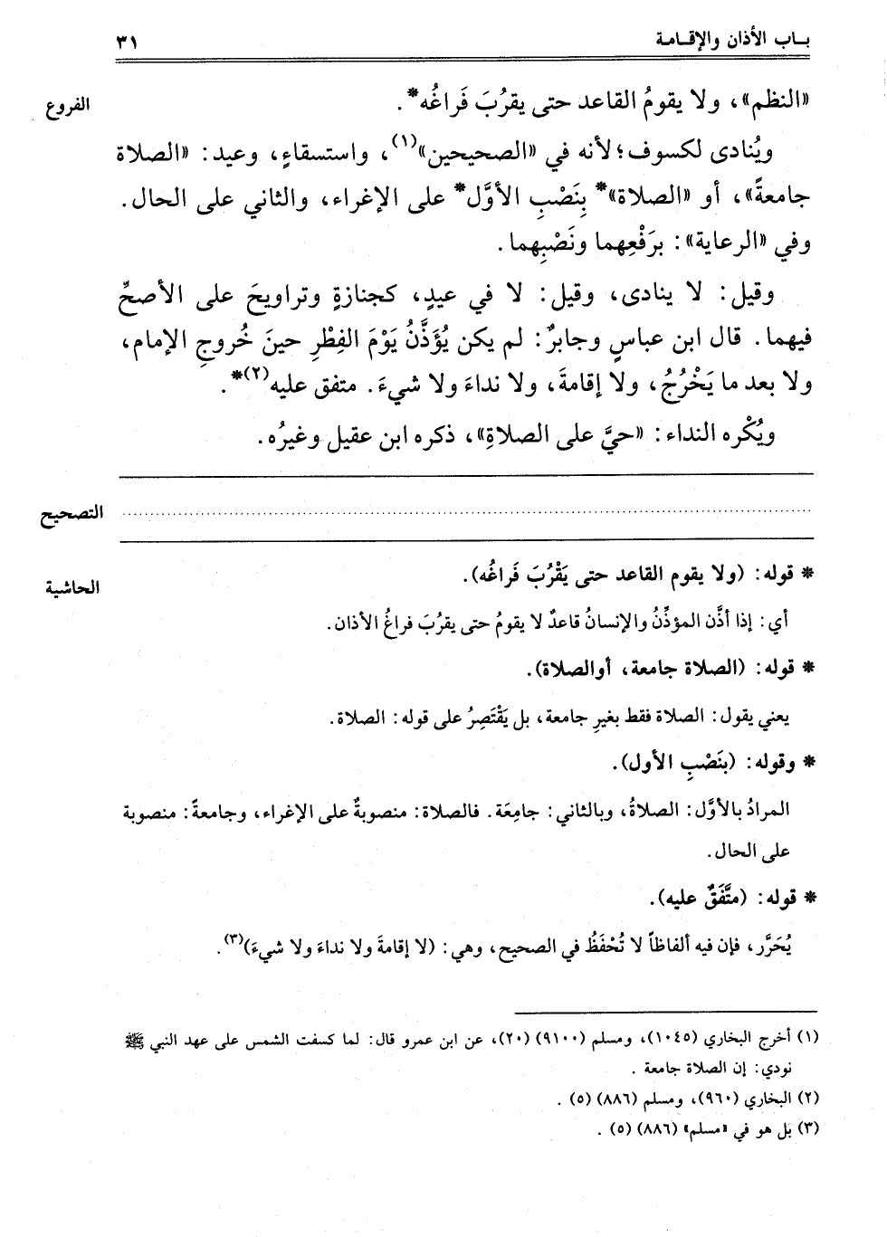 وَيُنَادَى لِكُسُوفٍ لِأَنَّهُ فِي الصَّحِيحَيْنِ1 وَاسْتِسْقَاءٍ وَعِيدٍ "الصَّلَاةُ جَامِعَةٌ" أَوْ الصَّلَاةَ بِنَصْبِ الْأَوَّلِ عَلَى الْإِغْرَاءِ، أَوْ الثَّانِيَ عَلَى الْحَالِ. وَفِي الرِّعَايَةِ بِرَفْعِهِمَا وَنَصْبِهِمَا.