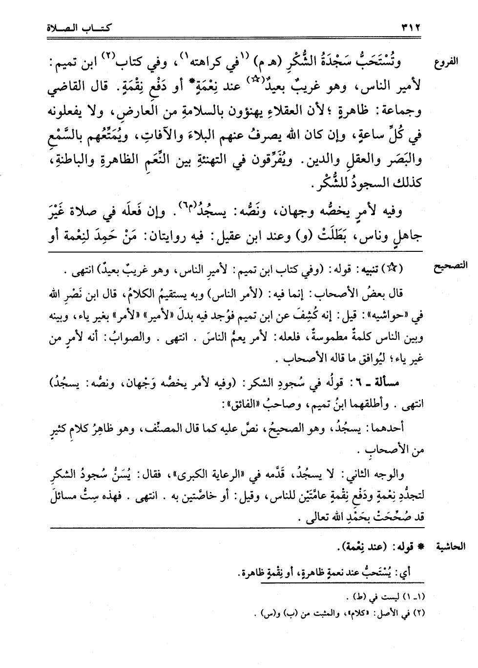 ويستحب سجدة الشكر "هـ م" "1في كراهته1" وَفِي كِتَابِ2 ابْنِ تَمِيمٍ لِأَمِيرِ النَّاسِ وَهُوَ غَرِيبٌ بَعِيدٌ، [يُرَاجَعُ التَّنْبِيهُ الْمَذْكُورُ فِي الذَّيْلِ] عِنْدَ نِعْمَةٍ أَوْ دَفْعِ نِقْمَةٍ، قَالَ الْقَاضِي وَجَمَاعَةٌ: [الْمُنَاسَبَةُ] ظَاهِرَةٌ لِأَنَّ الْعُقَلَاءَ يُهَنُّونَ بِالسَّلَامَةِ مِنْ الْعَارِضِ وَلَا يَفْعَلُونَهُ فِي كُلِّ سَاعَةٍ وَإِنْ كَانَ اللَّهُ يَصْرِفُ عَنْهُمْ الْبَلَاءَ وَالْآفَاتِ وَيُمَتِّعُهُمْ بِالسَّمْعِ وَالْبَصَرِ وَالْعَقْلِ وَالدِّينِ، وَيُفَرِّقُونَ فِي التَّهْنِئَةِ بَيْنَ النِّعَمِ الظَّاهِرَةِ وَالْبَاطِنَةِ كَذَلِكَ السُّجُودُ لِلشُّكْرِ. وَفِيهِ لِأَمْرٍ يَخُصُّهُ وَجْهَانِ وَنَصُّهُ يَسْجُدُ "م 6" وَإِنْ فَعَلَهُ فِي صَلَاةٍ غَيْرَ جَاهِلٍ وناس بطلت "و" وعند ابن عقيل فيه روايتان من حمد لنعمة أو