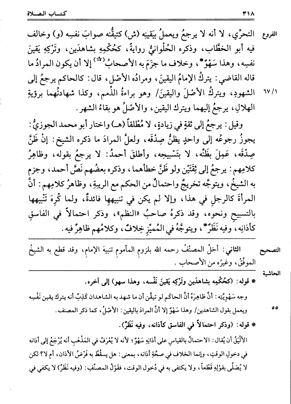 وَقِيلَ: يَرْجِعُ إلَى ثِقَةٍ فِي زِيَادَةٍ، لَا مُطْلَقًا "هـ" وَاخْتَارَ أَبُو مُحَمَّدٍ الْجَوْزِيُّ يَجُوزُ رُجُوعُهُ إلَى وَاحِدٍ بِظَنِّ صِدْقِهِ، وَلَعَلَّ الْمُرَادَ مَا ذَكَرَهُ الشَّيْخُ إنْ ظَنَّ صِدْقَهُ عَمِلَ بِظَنِّهِ، لَا بِتَسْبِيحِهِ، وَأَطْلَقَ أَحْمَدُ لَا يَرْجِعُ، بِقَوْلِهِ وَظَاهِرُ كَلَامِهِمْ يَرْجِعُ إلَى ثِقَتَيْنِ، وَلَوْ ظَنَّ خَطَأَهُمَا، وَذَكَرَهُ بَعْضُهُمْ نَصَّ أَحْمَدُ. وَجَزَمَ بِهِ الشَّيْخُ وَيَتَوَجَّهُ تَخْرِيجٌ، وَاحْتِمَالٌ مِنْ الْحُكْمِ مَعَ الرِّيبَةِ، وَظَاهِرُ كَلَامِهِمْ أَنَّ الْمَرْأَةَ كَالرَّجُلِ فِي هَذَا، وَإِلَّا لَمْ يَكُنْ لِتَنْبِيهِهَا فَائِدَةٌ، وَلَمَّا كُرِهَ تَنْبِيهُهَا بِالتَّسْبِيحِ وَنَحْوِهِ وَقَدْ ذَكَرَهُ صَاحِبُ النَّظْمِ وَذَكَرَ احْتِمَالًا فِي الْفَاسِقِ كَأَذَانِهِ، وَفِيهِ نَظَرٌ، وَيَتَوَجَّهُ فِي الْمُمَيِّزِ خِلَافٌ، وكلامهم ظاهر فيه.