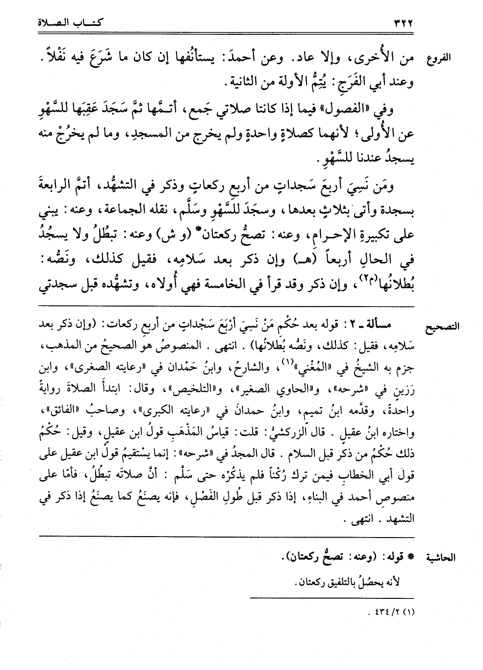 ـــــــــــــــــــــــــــــQمَسْأَلَةٌ 2: قَوْلُهُ بَعْدَ حُكْمِ مَنْ نَسِيَ أَرْبَعَ سَجَدَاتٍ مِنْ أَرْبَعِ رَكَعَاتٍ وَإِنْ ذَكَرَ بَعْدَ سَلَامِهِ فَقِيلَ كَذَلِكَ وَنَصُّهُ بُطْلَانُهَا انْتَهَى، الْمَنْصُوصُ هُوَ الصَّحِيحُ مِنْ الْمَذْهَبِ، جَزَمَ بِهِ الشَّيْخُ فِي الْمُغْنِي1، وَالشَّارِحُ وَابْنُ حَمْدَانَ فِي رِعَايَتِهِ الصُّغْرَى، وَابْنُ رَزِينٍ فِي شَرْحِهِ، وَالْحَاوِي الصَّغِيرِ، وَالتَّلْخِيصِ، وَقَالَ ابْتَدَأَ الصَّلَاةَ رِوَايَةً وَاحِدَةً، وَقَدَّمَهُ ابْنُ تَمِيمٍ، وَابْنُ حَمْدَانَ فِي رِعَايَتِهِ الْكُبْرَى، وَصَاحِبُ الْفَائِقِ، وَاخْتَارَهُ ابْنُ عَقِيلٍ، قَالَ الزَّرْكَشِيّ قُلْتُ قِيَاسُ الْمَذْهَبِ قَوْلُ ابْنِ عَقِيلٍ، وَقِيلَ حُكْمُ ذَلِكَ حُكْمُ مَنْ ذَكَرَ قَبْلَ السَّلَامِ، قَالَ الْمَجْدُ فِي شَرْحِهِ إنَّمَا يَسْتَقِيمُ قَوْلُ ابْنِ عَقِيلٍ عَلَى قَوْلِ أَبِي الْخَطَّابِ فِيمَنْ تَرَكَ رُكْنًا فَلَمْ يَذْكُرْهُ حَتَّى سَلَّمَ إنَّ صَلَاتَهُ تَبْطُلُ، فَأَمَّا عَلَى مَنْصُوصِ أَحْمَدَ فِي الْبِنَاءِ إذَا ذَكَرَ قَبْلَ طُولِ الْفَصْلِ فَإِنَّهُ يَصْنَعُ كَمَا يَصْنَعُ إذَا ذَكَرَ فِي التَّشَهُّدِ. انتهى.
