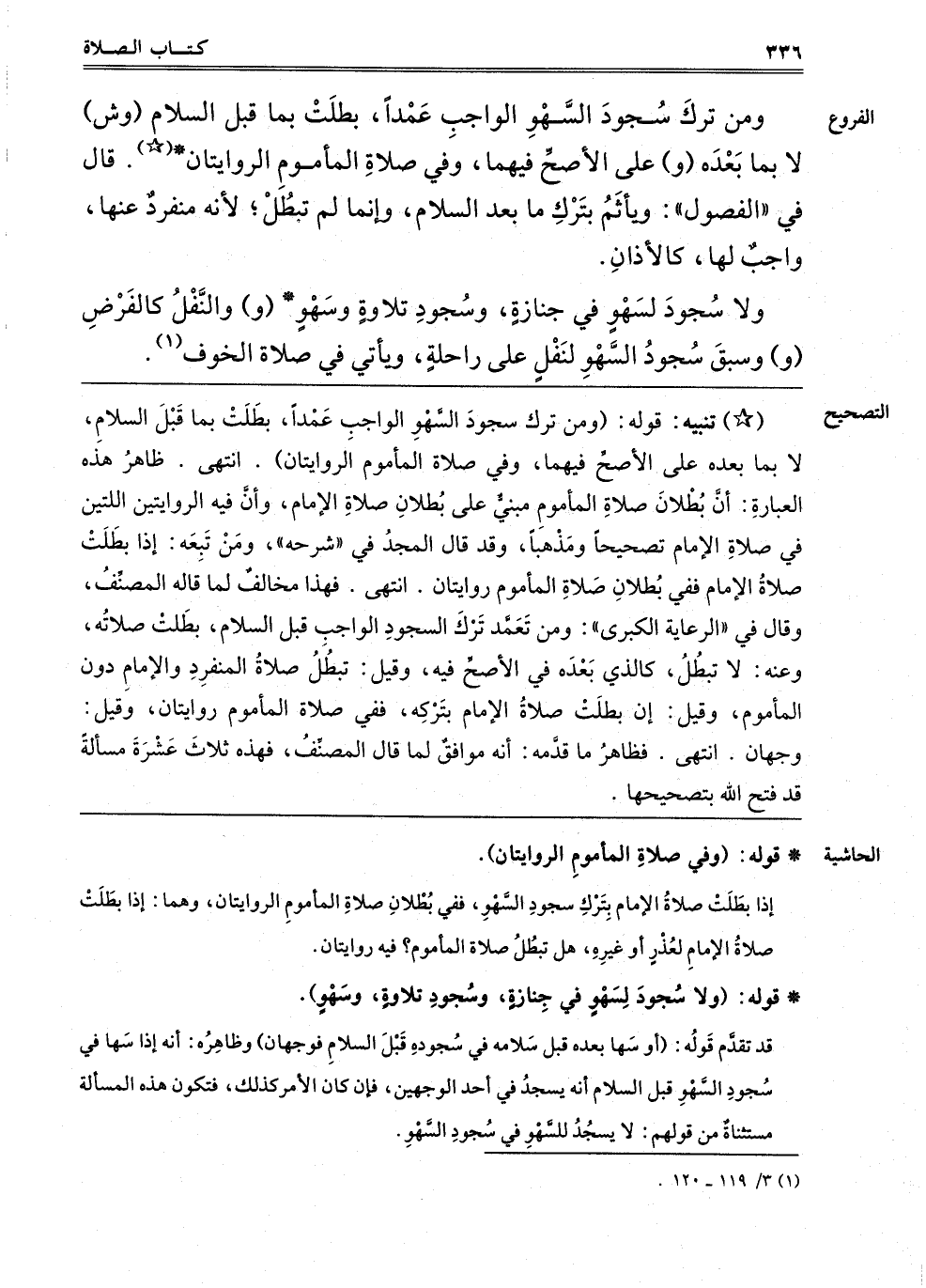 ـــــــــــــــــــــــــــــQتَنْبِيهٌ: قَوْلُهُ: وَمَنْ تَرَكَ سُجُودَ السَّهْوِ الْوَاجِبَ عَمْدًا بَطَلَتْ بِمَا قَبْلَ السَّلَامِ، لَا بِمَا بَعْدَهُ عَلَى الْأَصَحِّ فِيهِمَا، وَفِي صَلَاةِ الْمَأْمُومِ الرِّوَايَتَانِ. انْتَهَى. ظَاهِرُ هَذِهِ الْعِبَارَةِ أَنَّ بُطْلَانَ صَلَاةِ الْمَأْمُومِ مَبْنِيٌّ عَلَى بُطْلَانِ صَلَاةِ الْإِمَامِ، وَأَنَّ فِيهِ الرِّوَايَتَيْنِ اللَّتَيْنِ فِي صَلَاةِ الْإِمَامِ تَصْحِيحًا وَمَذْهَبًا، وَقَدْ قَالَ الْمَجْدُ فِي شَرْحِهِ وَمَنْ تَبِعَهُ إذَا بَطَلَتْ صَلَاةُ الْإِمَامِ فَفِي بُطْلَانِ صَلَاةِ الْمَأْمُومِ رِوَايَتَانِ انْتَهَى، فَهَذَا مُخَالِفٌ لِمَا قَالَهُ الْمُصَنِّفُ. وَقَالَ فِي الرِّعَايَةِ الْكُبْرَى وَمَنْ تَعَمَّدَ تَرْكَ السُّجُودِ الْوَاجِبَ قَبْلَ السَّلَامِ بَطَلَتْ صَلَاتُهُ وَعَنْهُ لَا تَبْطُلُ، كَاَلَّذِي بَعْدَهُ فِي الْأَصَحِّ فِيهِ، وَتَبْطُلُ صَلَاةُ الْمُنْفَرِدِ وَالْإِمَامِ دُونَ الْمَأْمُومِ، وَقِيلَ إنْ بَطَلَتْ صَلَاةُ الْإِمَامِ بِتَرْكِهِ فَفِي صَلَاةِ الْمَأْمُومِ رِوَايَتَانِ، وَقِيلَ وَجْهَانِ انْتَهَى فَظَاهِرُ مَا قَدَّمَهُ أَنَّهُ مُوَافِقٌ لِمَا قَالَ الْمُصَنِّفُ، فَهَذِهِ ثَلَاثَ عَشْرَةَ مَسْأَلَةً قَدْ فَتَحَ اللَّهُ بِتَصْحِيحِهَا.